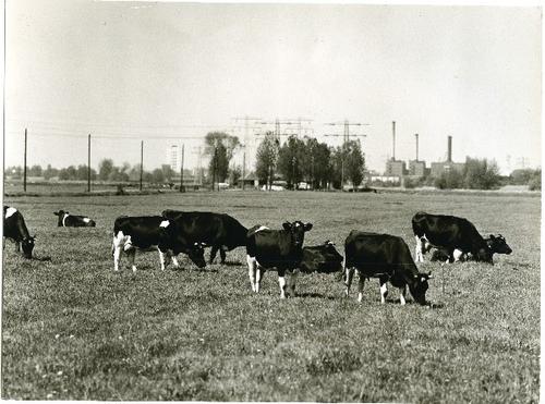 Foto in zwart-wit van koeien in een weiland bij een ...