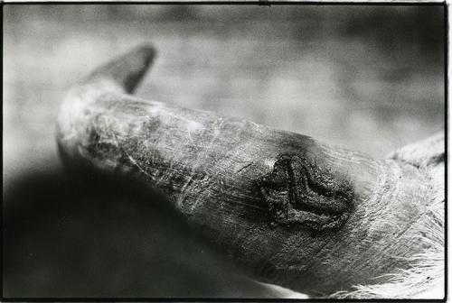Foto in zwart-wit van kalveren en geiten in een stal...