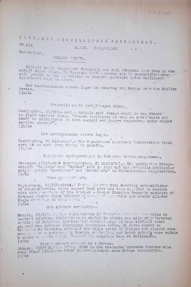 Algemeen Nederlandsch Persbureau, mededelingen, 22 m...