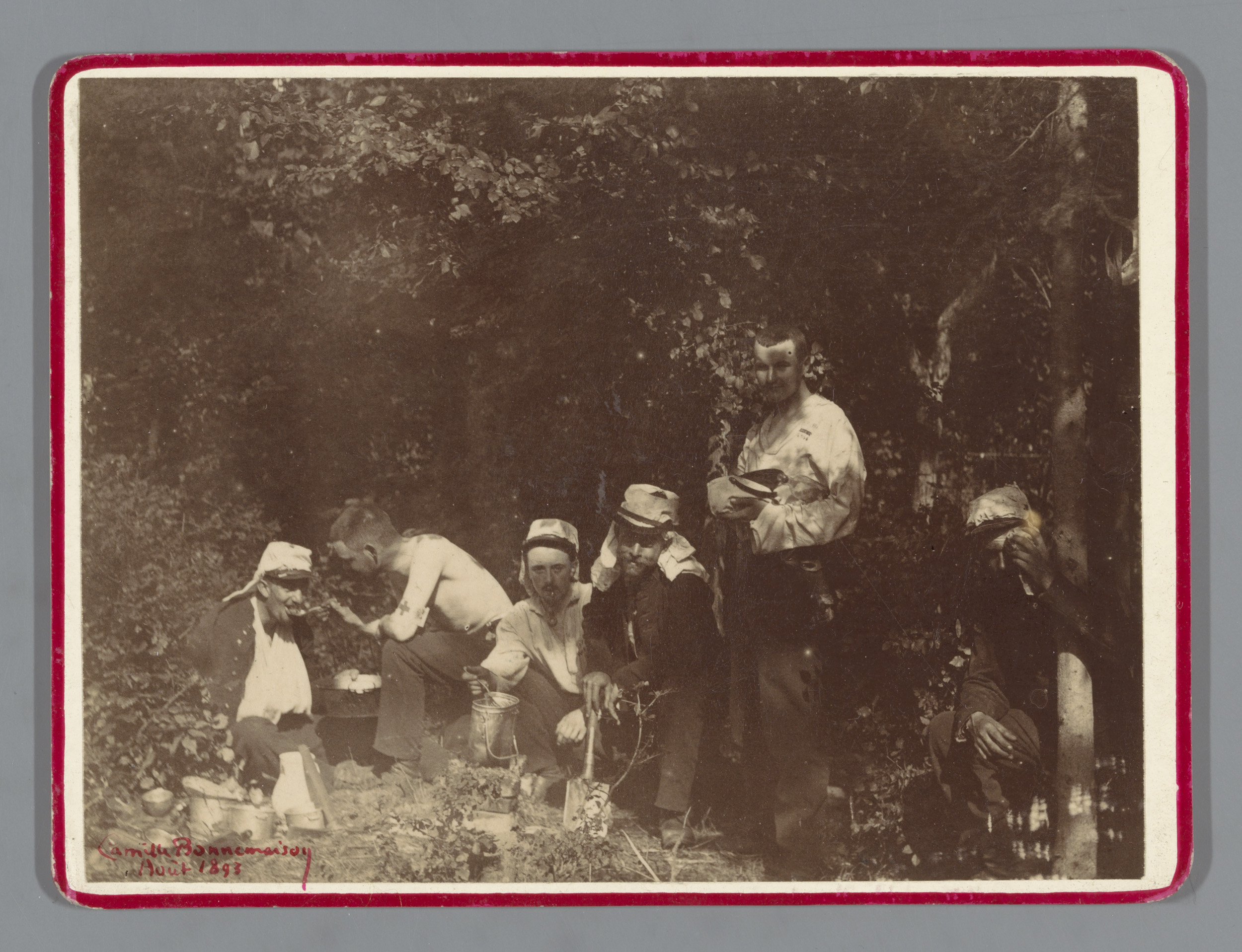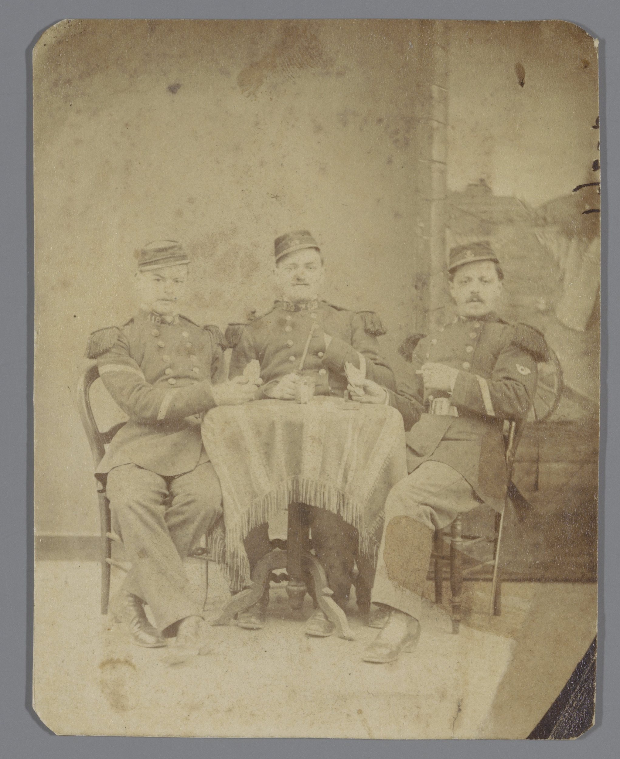 Portret van drie soldaten rond een tafel