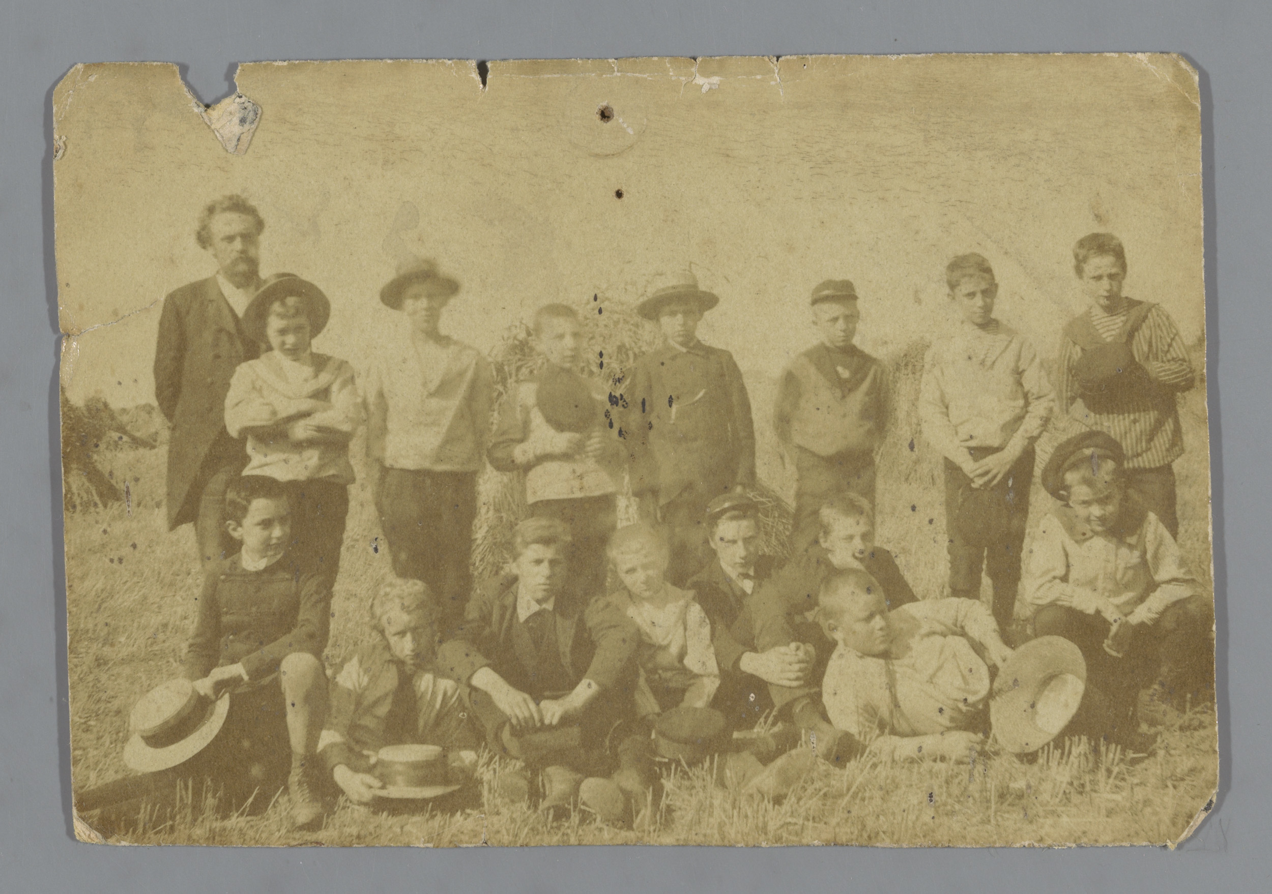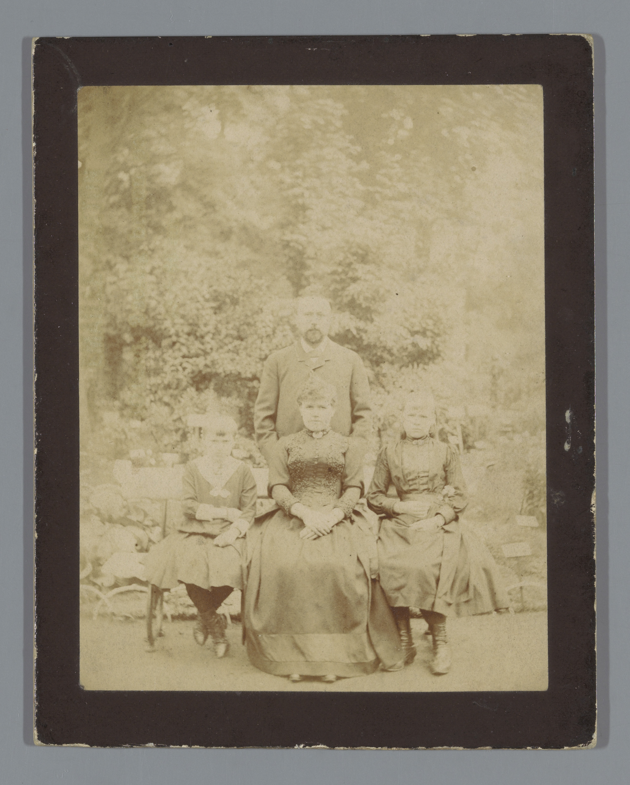 Familieportret van onbekende mensen in een tuin