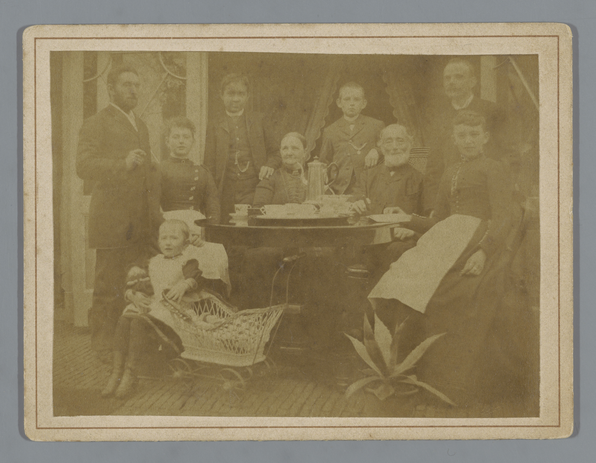 Groepsportret van een onbekende familie rond een tafel