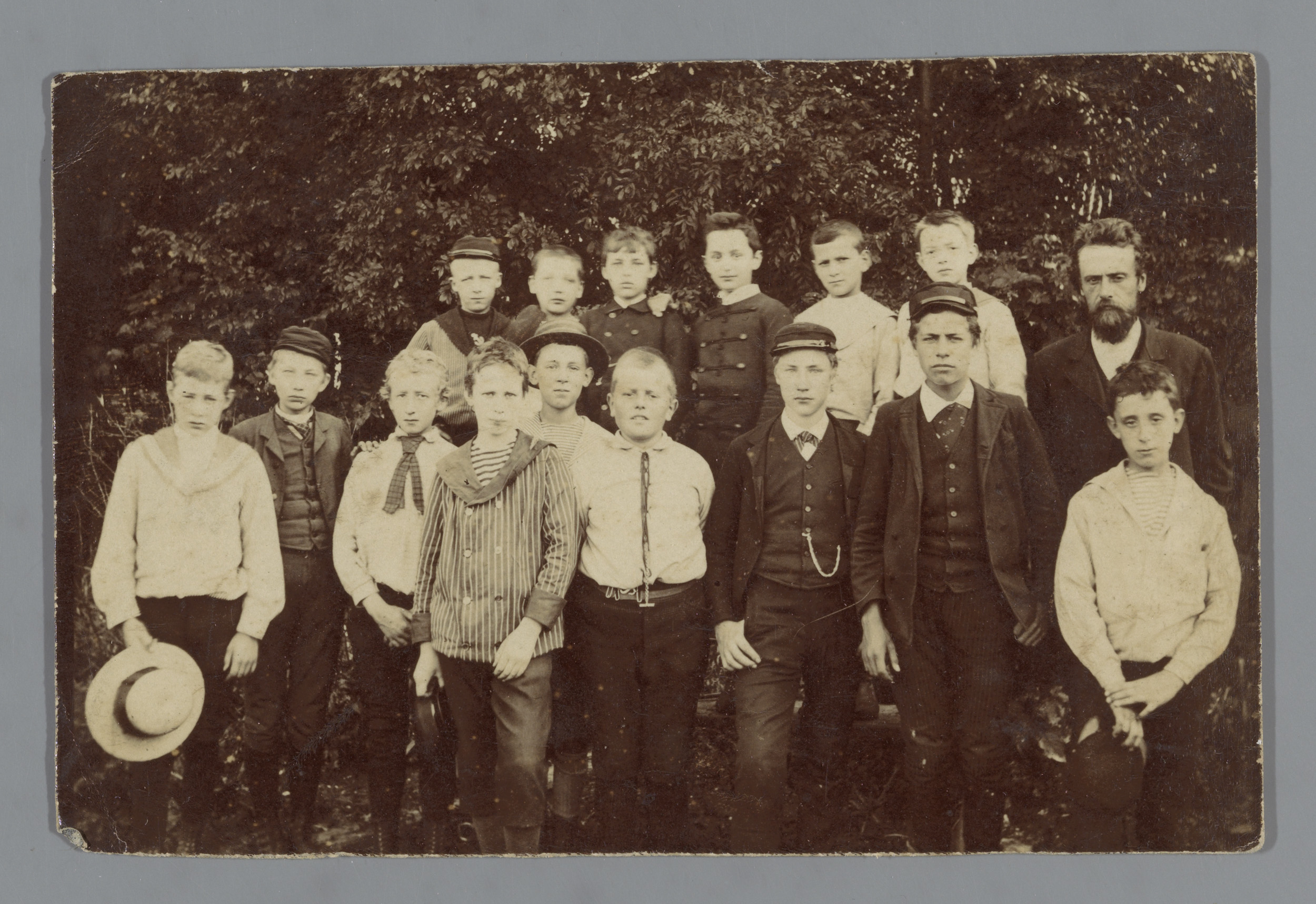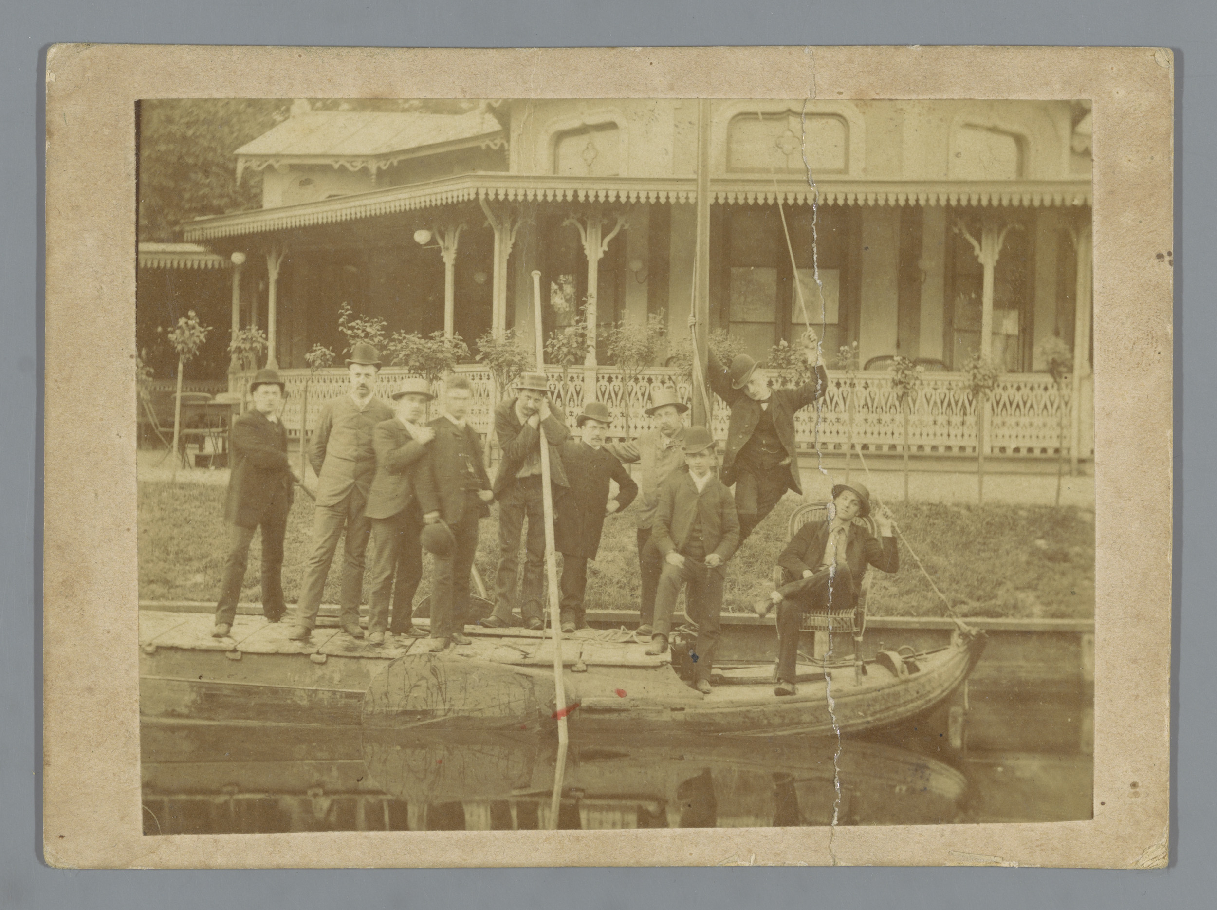 Groepsportret van onbekende jongemannen op een sloep...