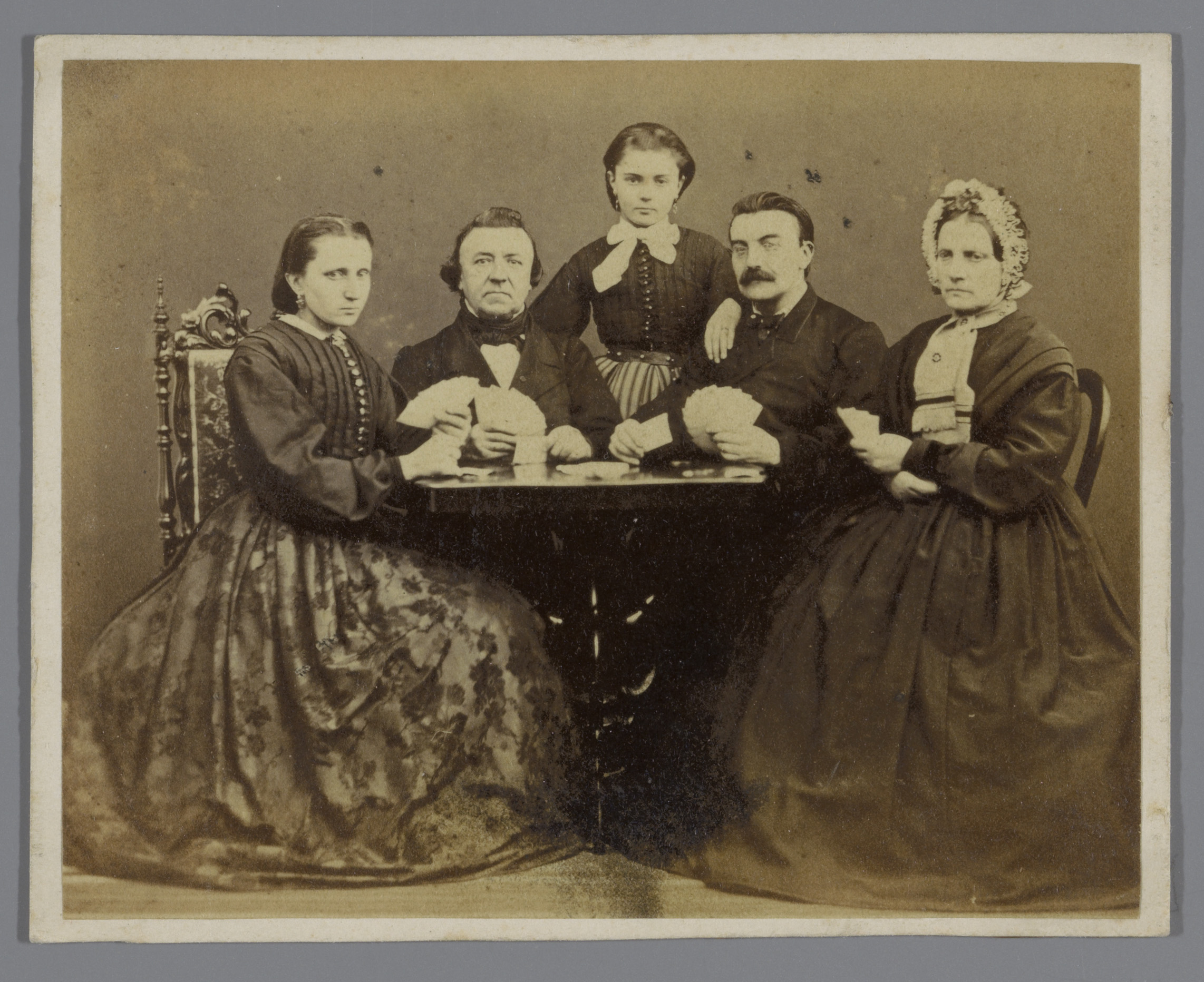 Groepsportret van een kaartspelend gezelschap rond e...