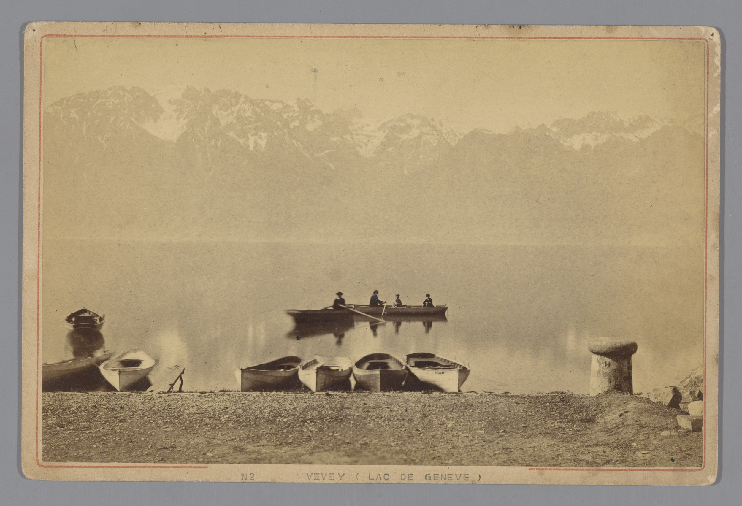 Gezicht op het meer van Genève met roeiboten bij Vevey