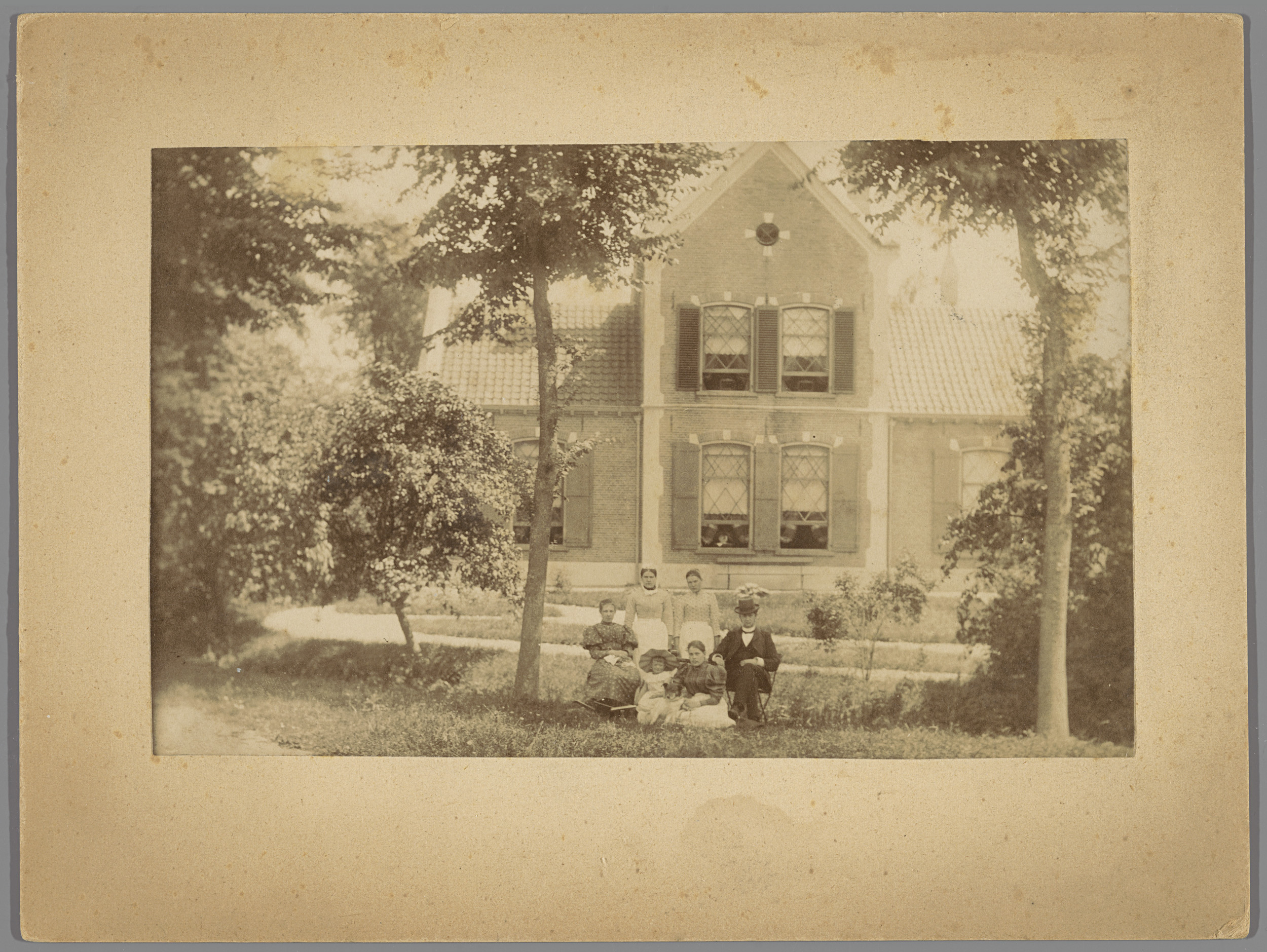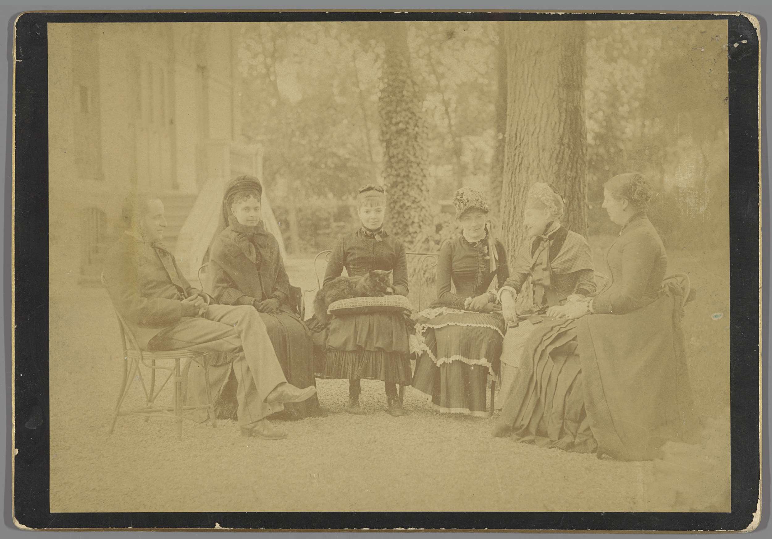 Familieportret met onbekende personen in een tuin