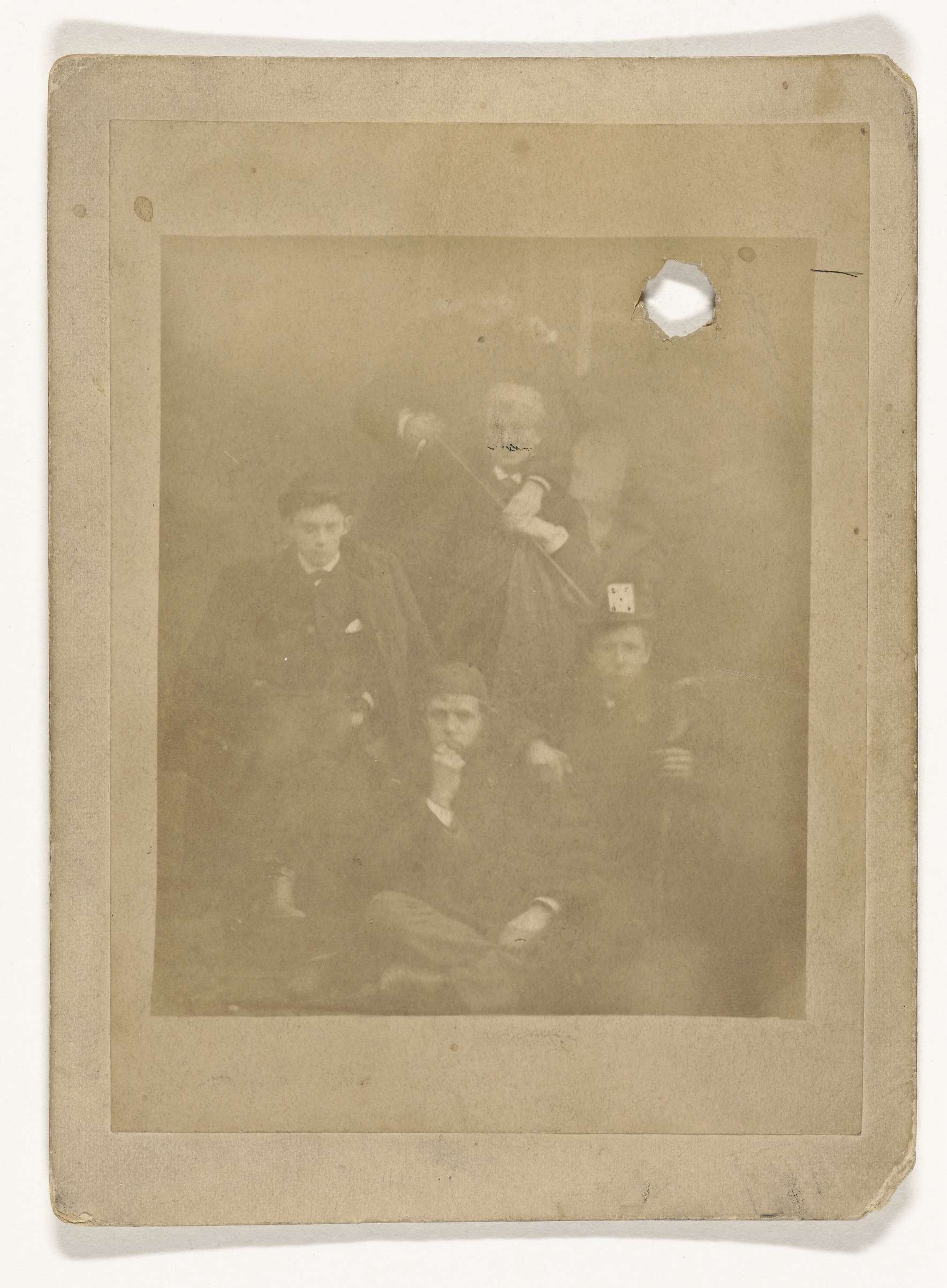 Groepsportret van zes studenten, van wie twee in mas...