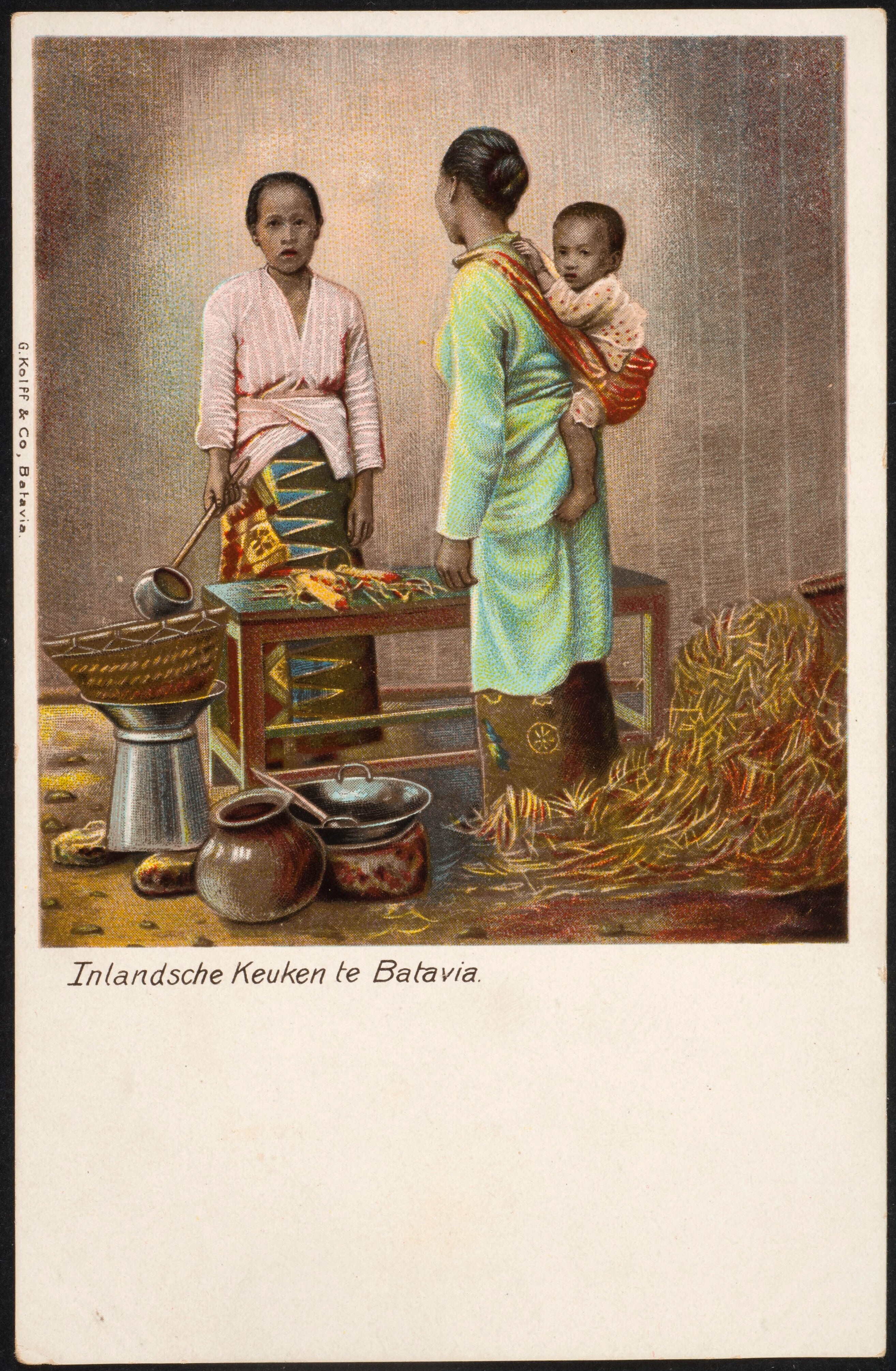 Chromolitho van een keuken in Batavia