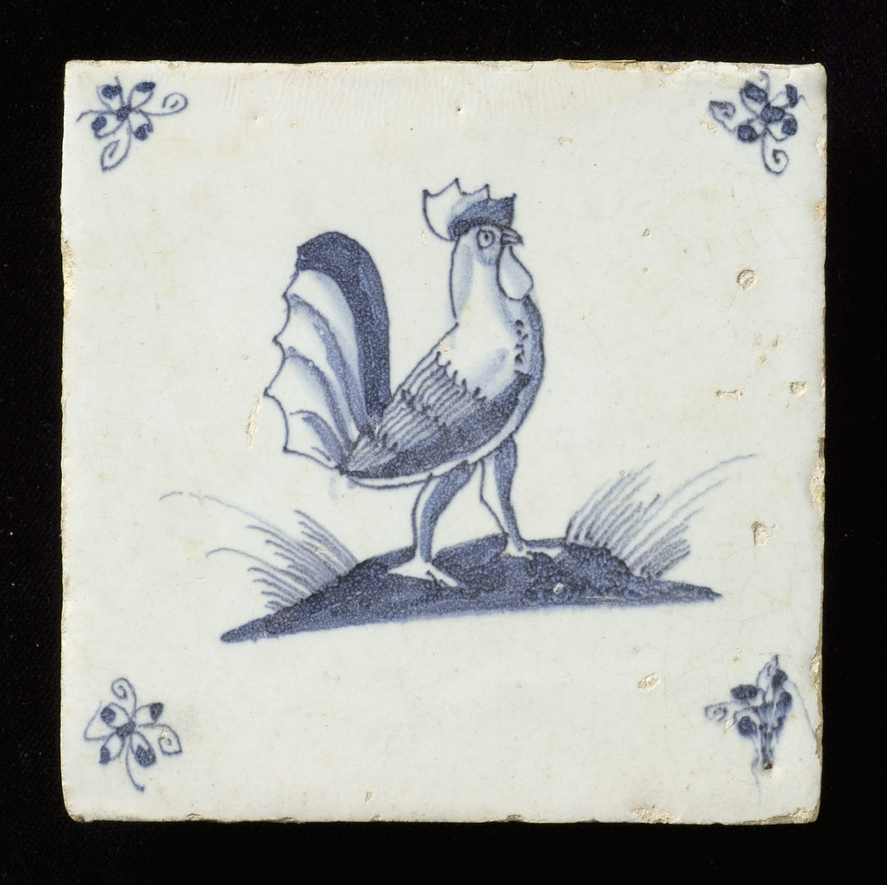 Tegel in tinglazuur, voorstellende pronkende haan op...