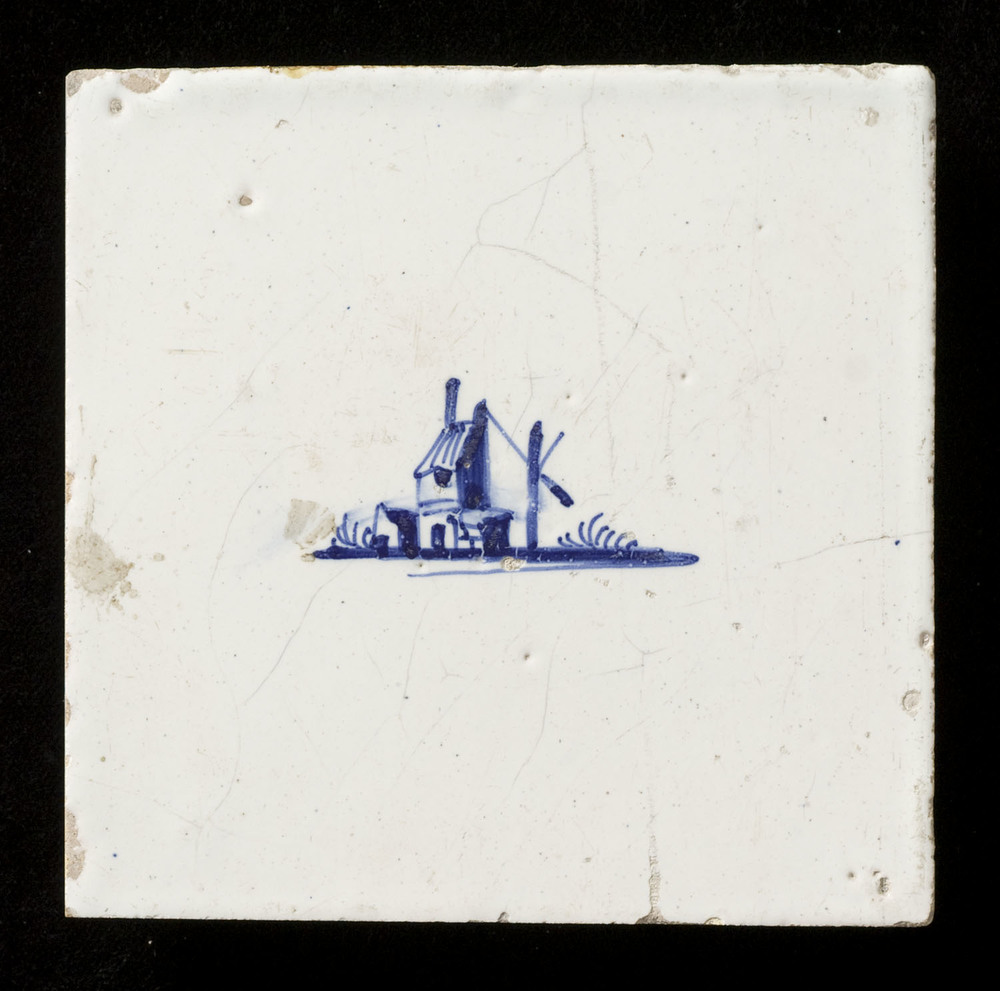 Tegel in tinglazuur, voorstellende molen in landscha...