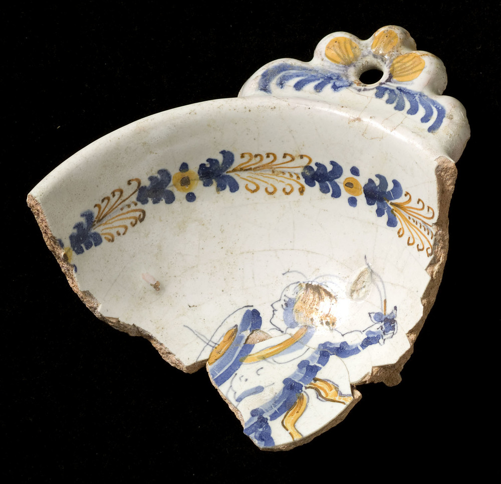 Scherf van keramiek, tinglazuur, voorstellende een c...