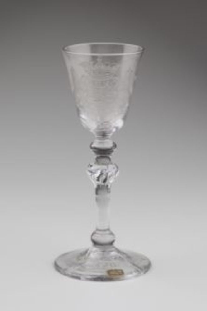 glas, geëtst. Platte ronde voet, lange balustervormi...