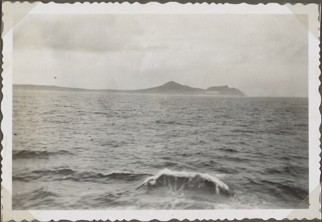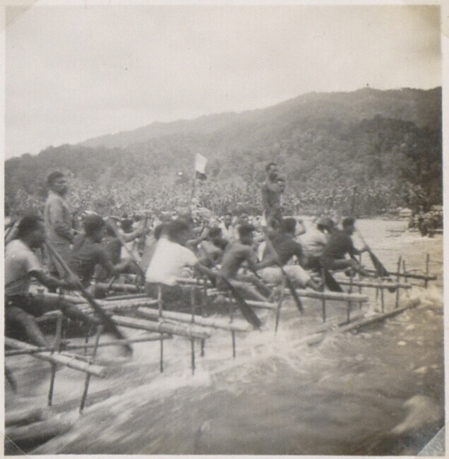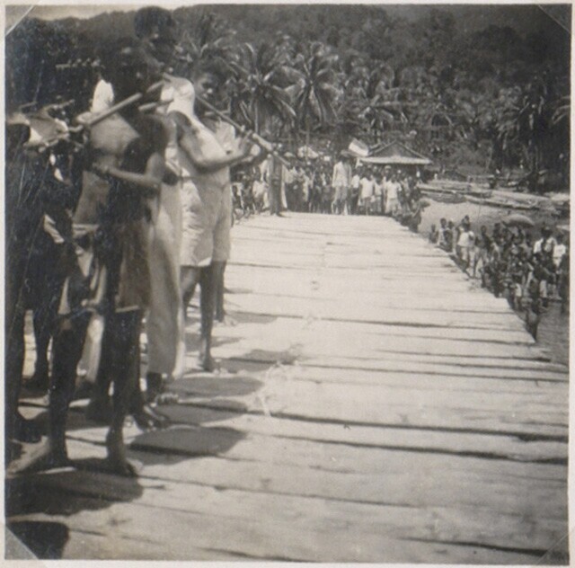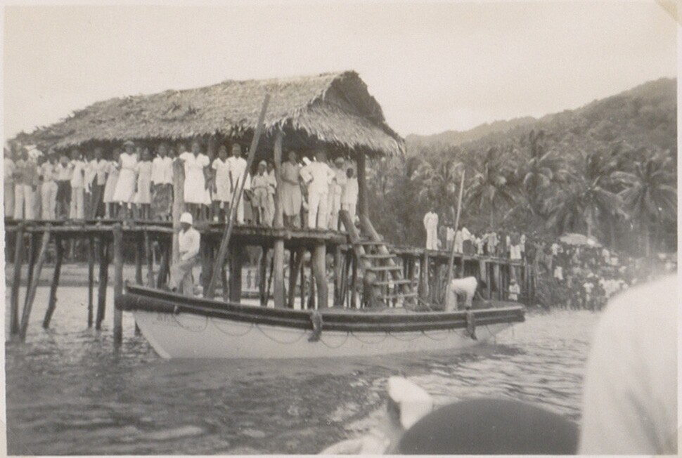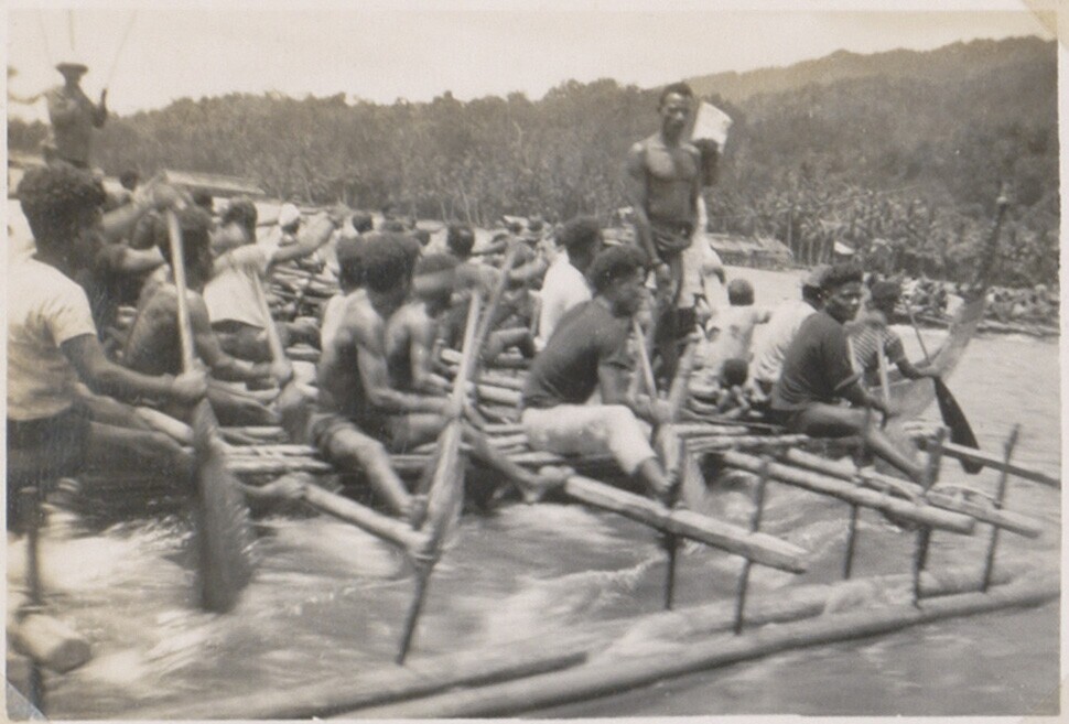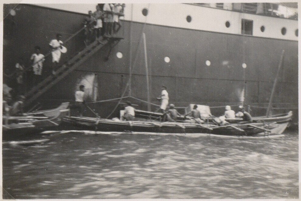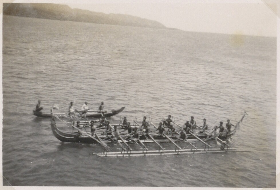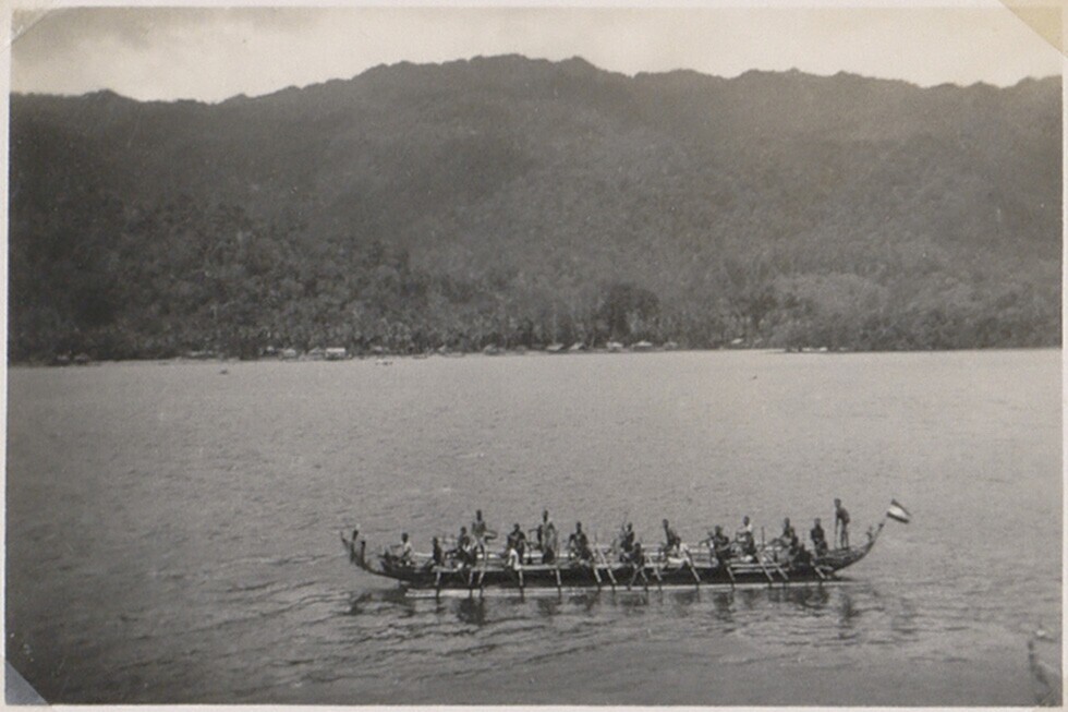 Prauwen op zee, in de achtergrond Korido