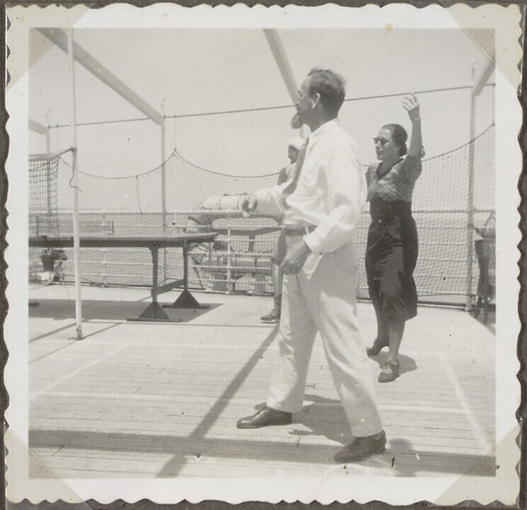 Portret van twee vrouwen op ligstoelen op dek