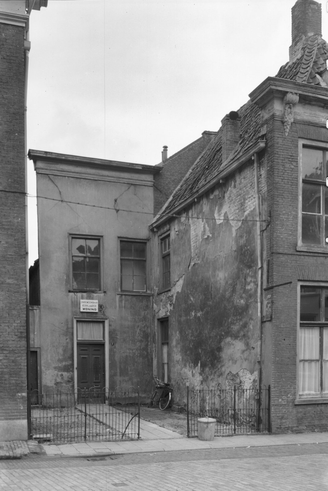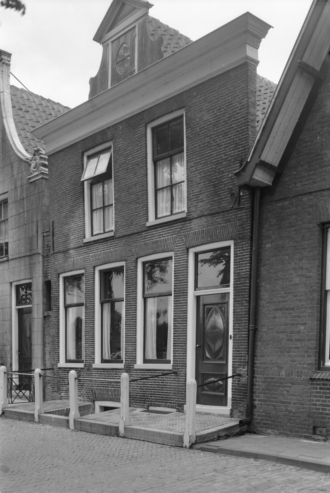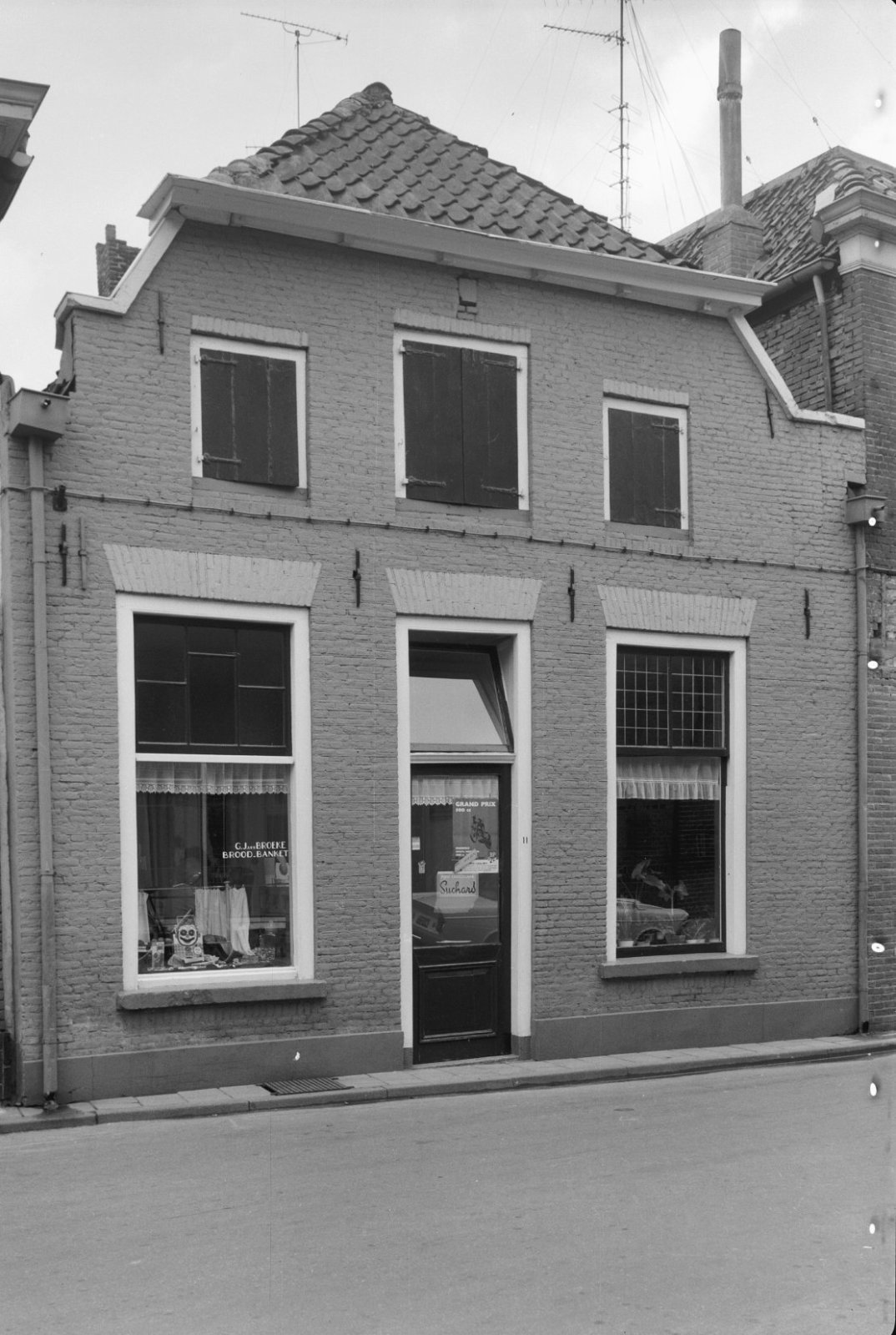 Voor- en zijgevel van eenlaags pand met ramen met ro...