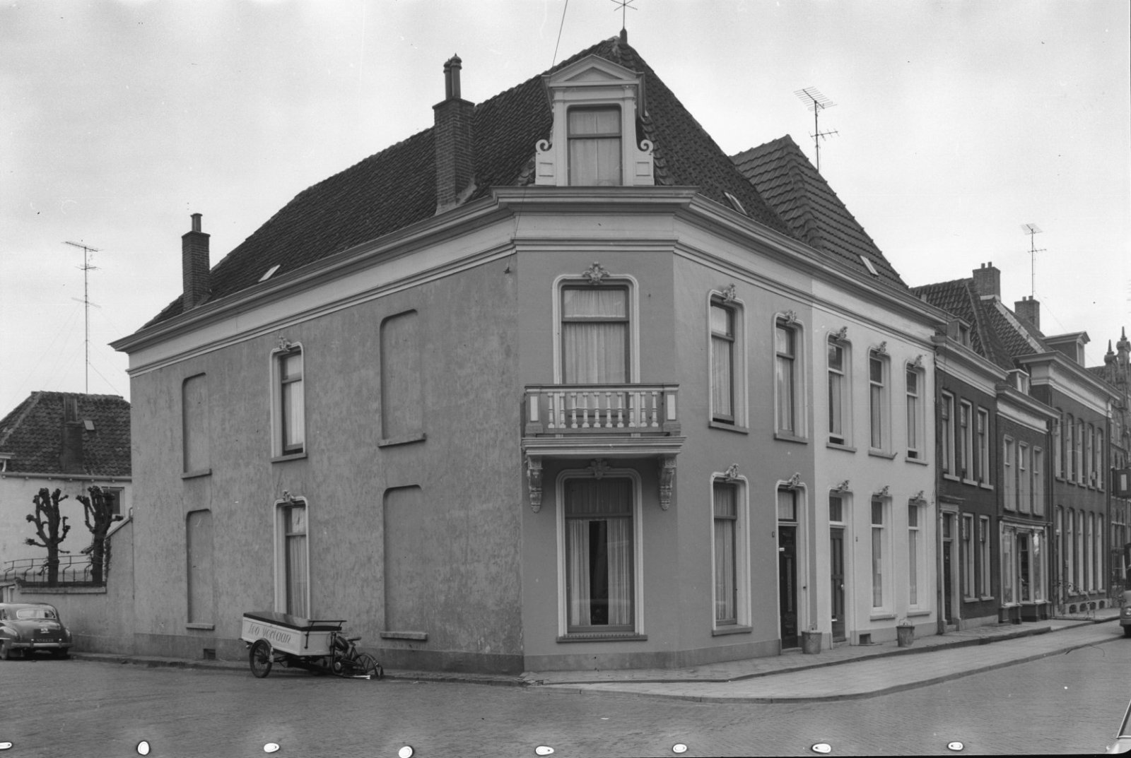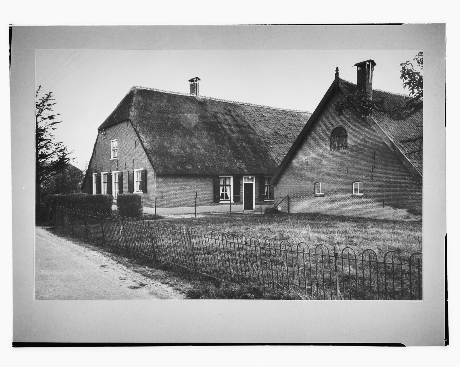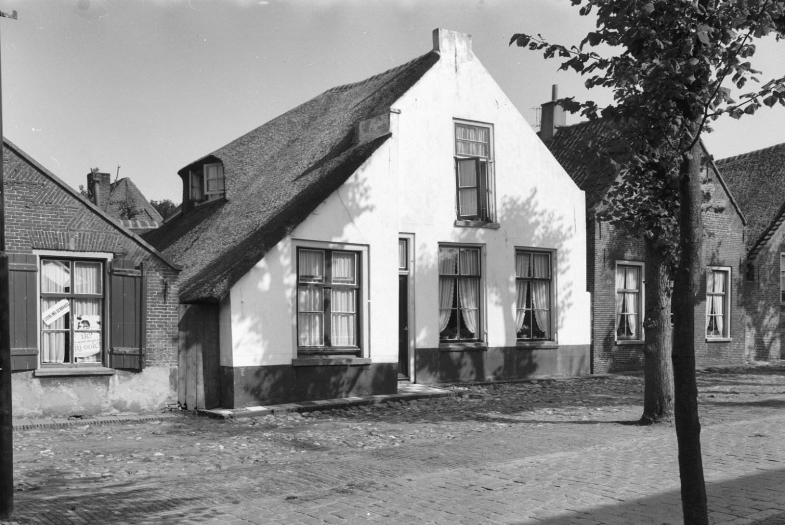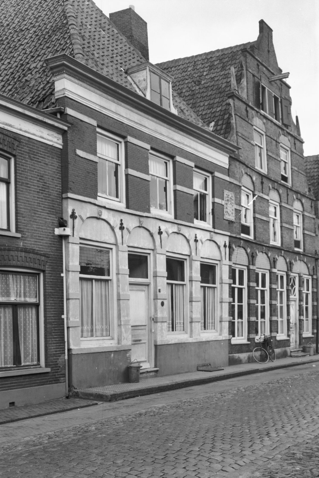 Voor- en zijgevel van eenlaags pand met ramen met ro...