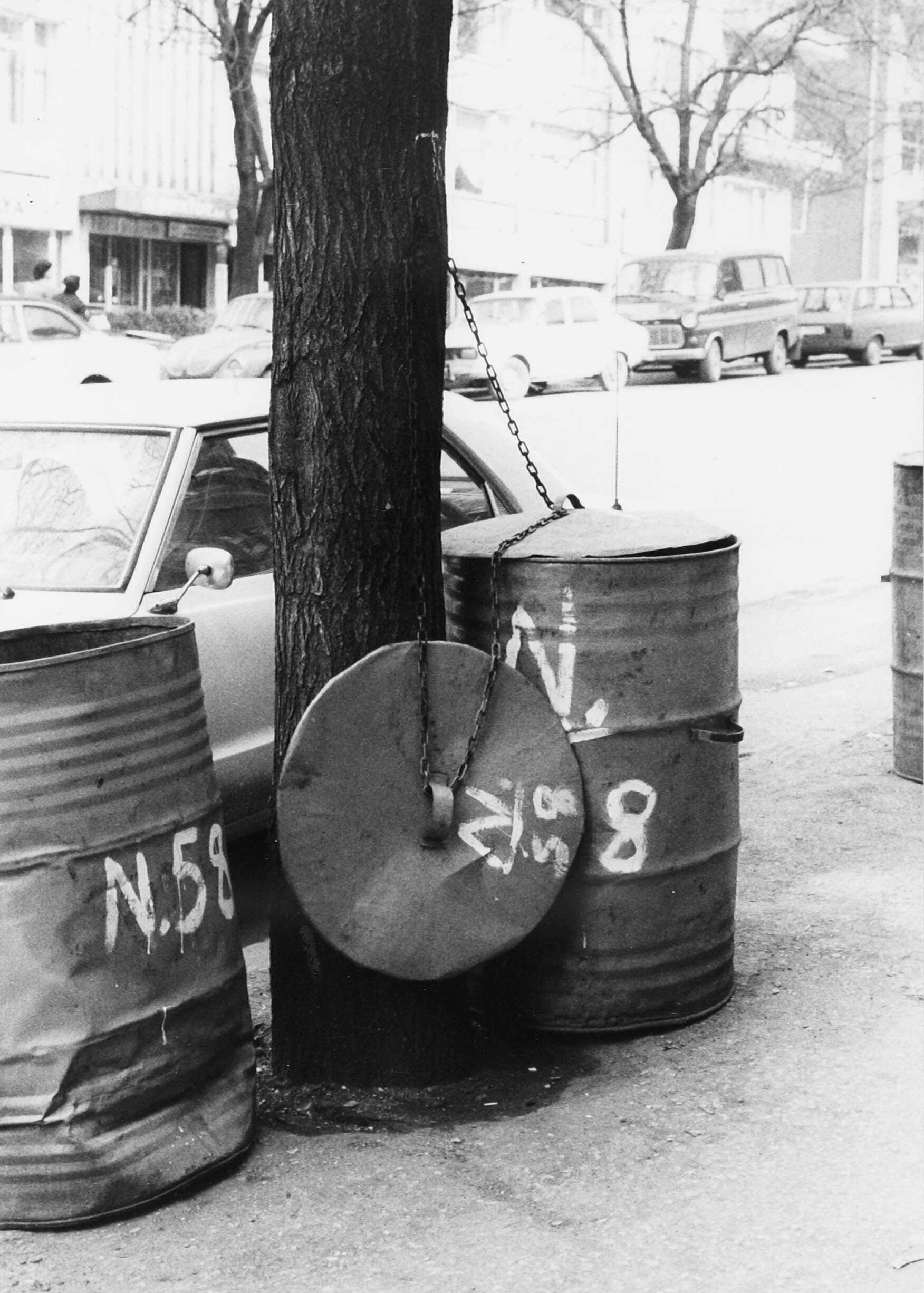 Anakra, straatbeeld. De deksels van de vuilnisvaten ...