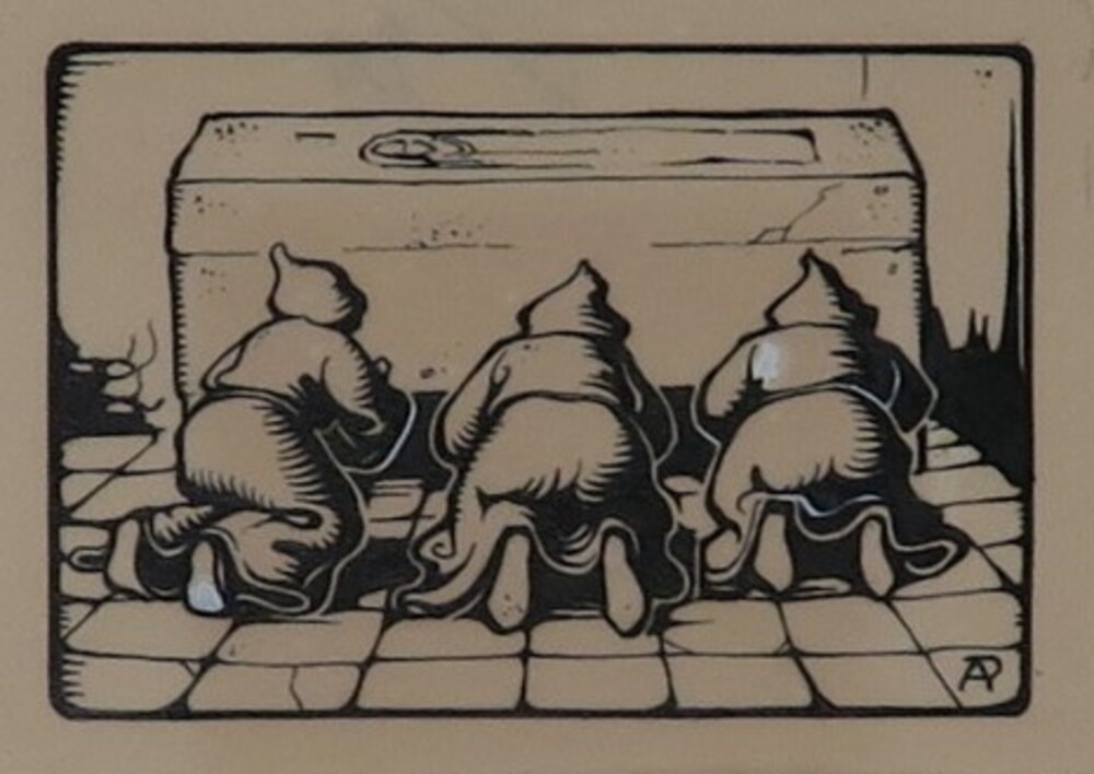 Drie pelgrims bij de graftombe van St. Servatius, bo...