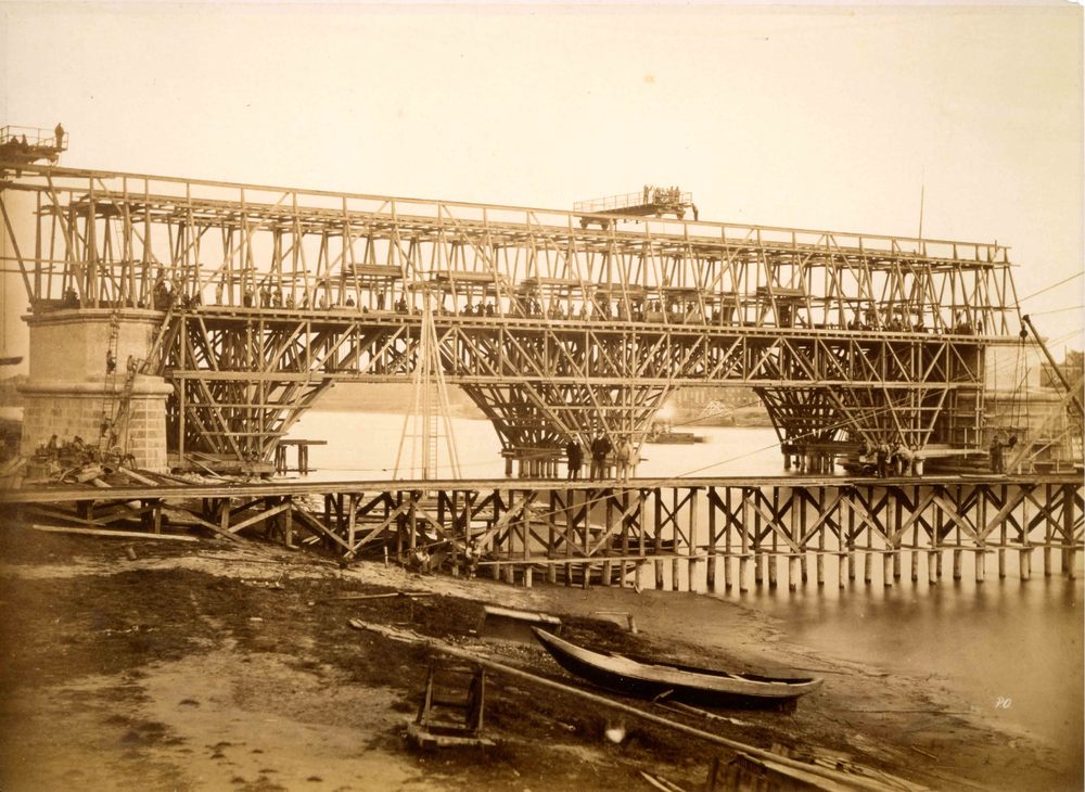 Foto, voorstellende de bouw van de spoorbrug te Cule...