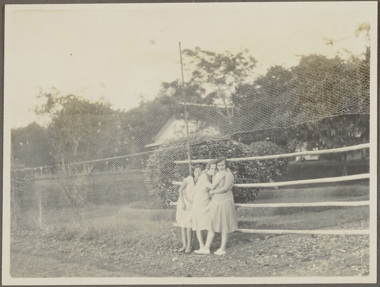 Portret van drie vrouwen voor een hek