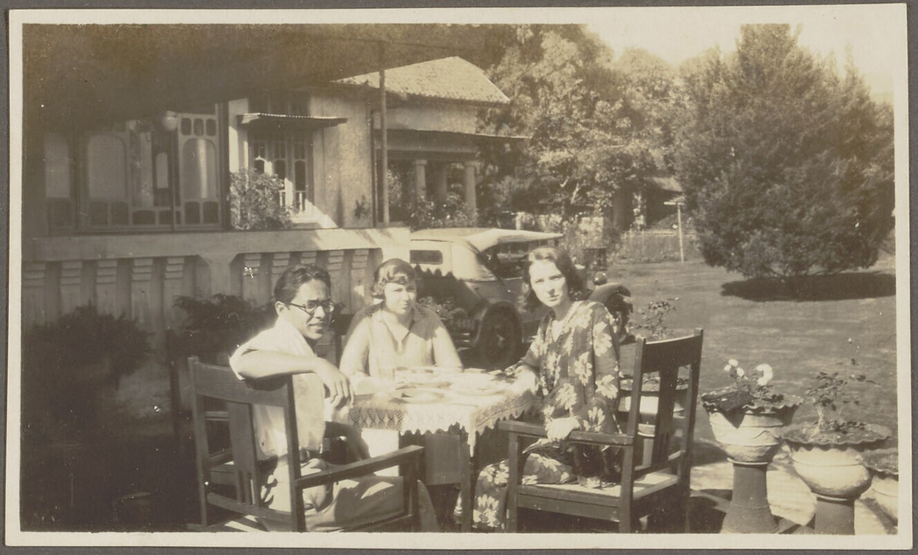Portret van twee vrouwen en één man aan tafel in de ...