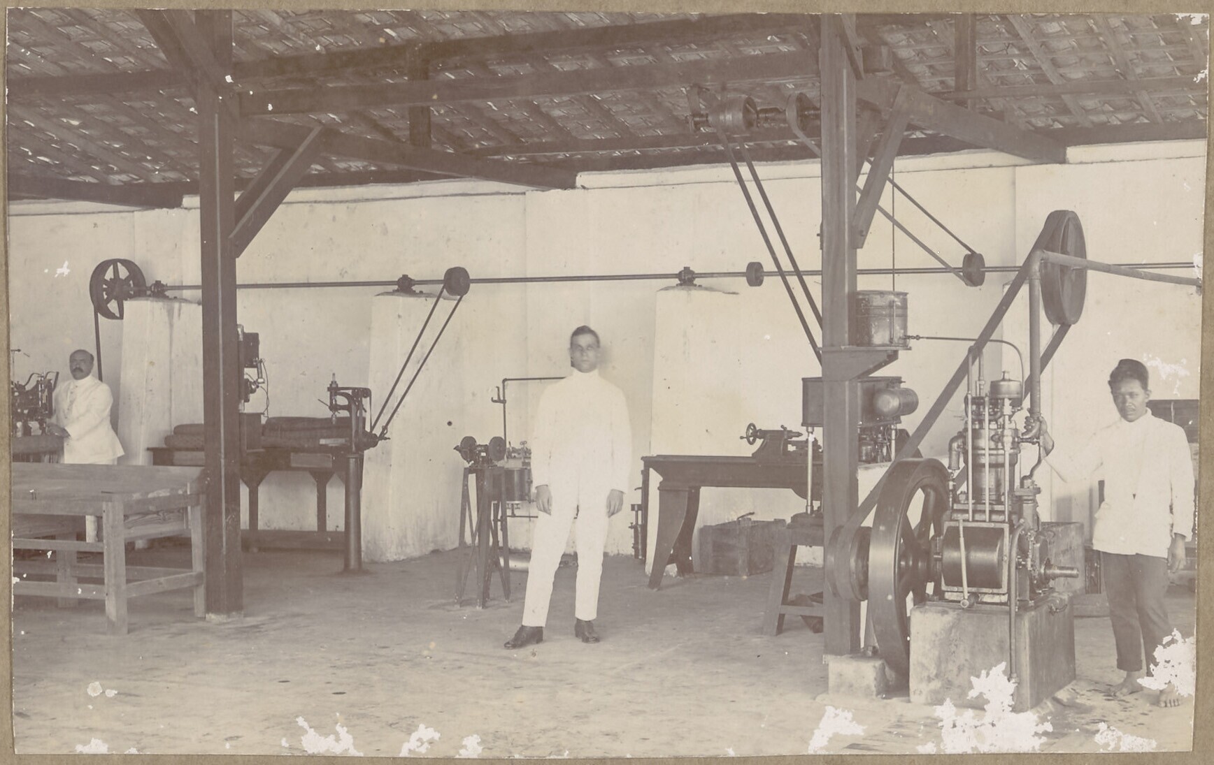 Cohen met Indische medewerkers naast machines in fab...