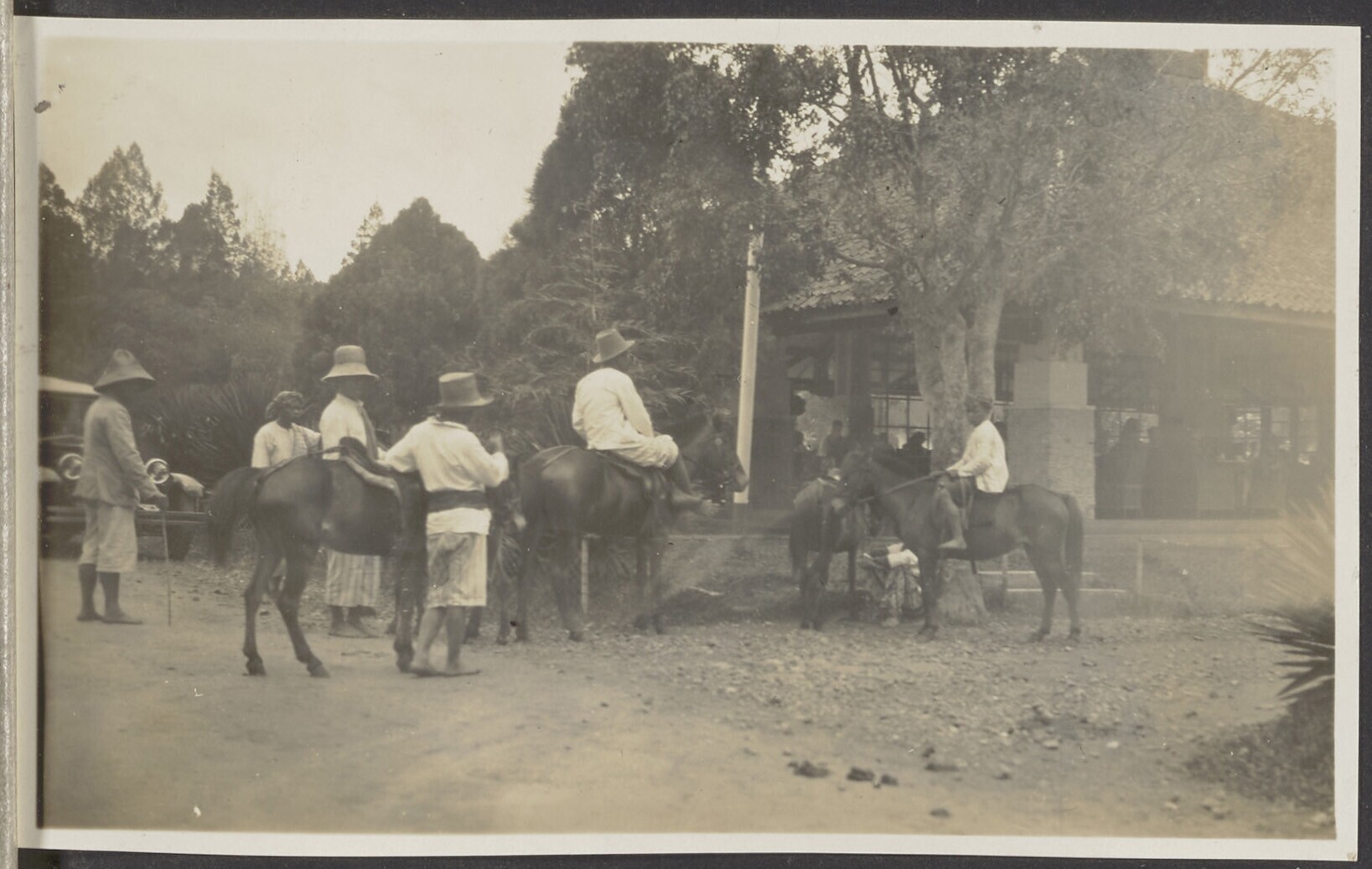Javaanse ruiters staan bij elkaar op de straat bij e...