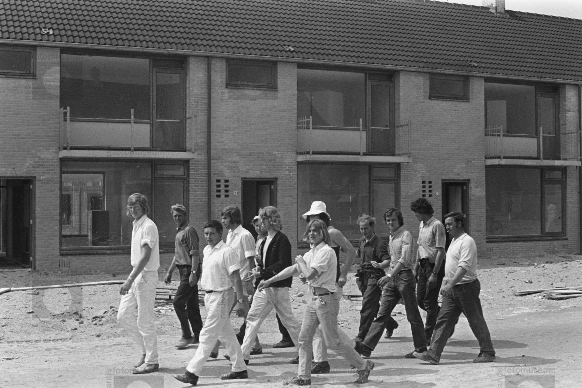 Zaandam. Actievoerende bouwvakkers op de bouwplaats,...