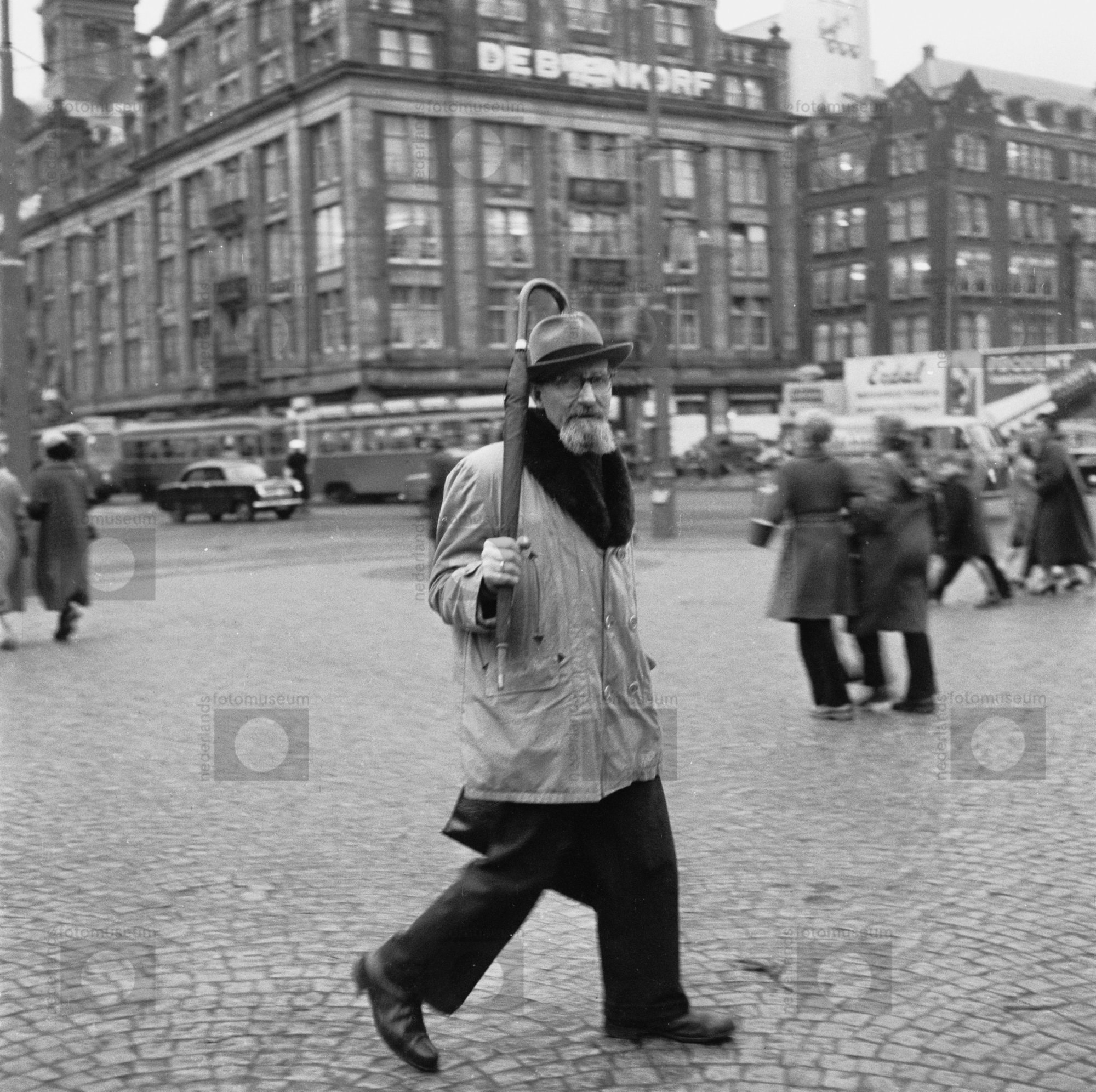 Amsterdam Damplein, oude man met hoed en wandelstok