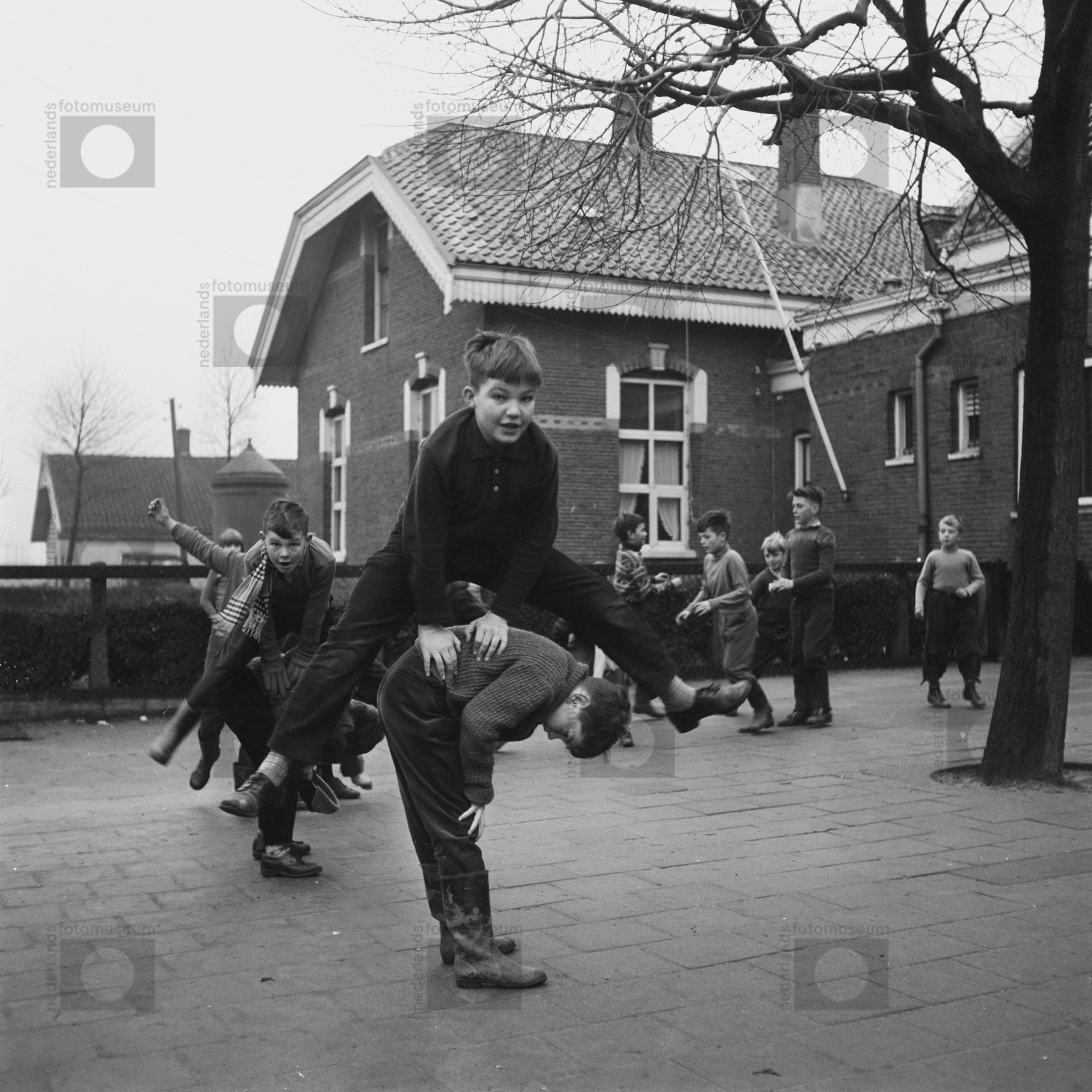 Amsterdam, Sloterdijk. Bokspringen op schoolplein.