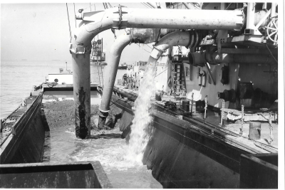Bakkenzuiger, bezig een met zand geladen bak leeg te...