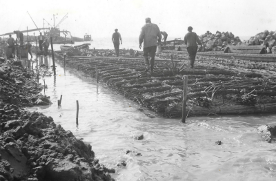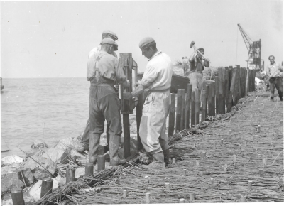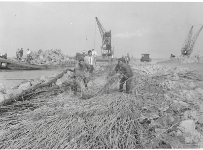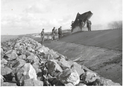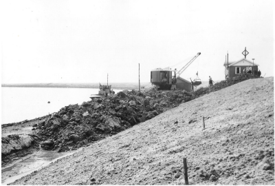 Aanleg van de ringdijk van Oostelijk Flevoland, 1951...