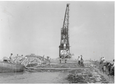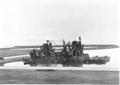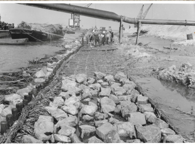 Aanleg van polderdijk met schepen en barakken