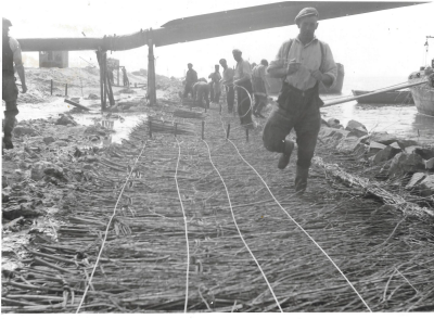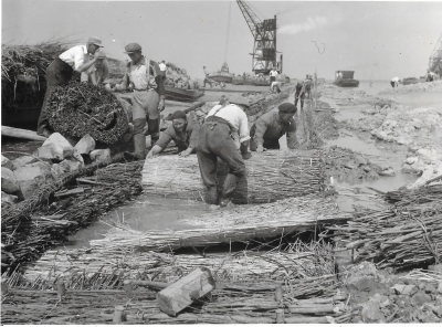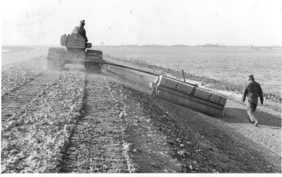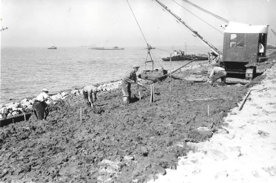 Dijkbouw Oostelijk Flevoland. Het inheien van perkoe...