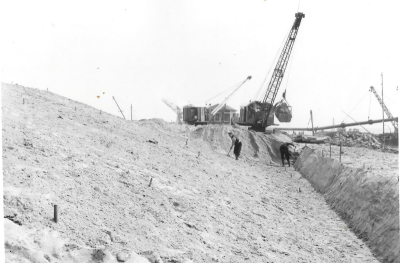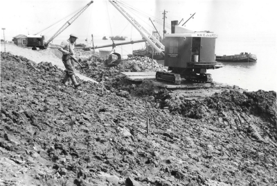 Hijskranen bezig keileem aan te brengen op het dijkl...