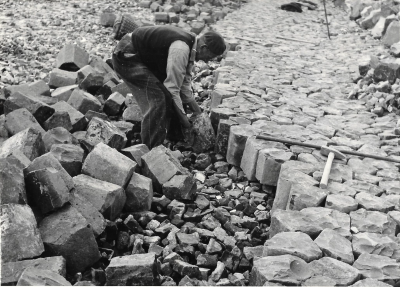 Steenzetter bezig stenen aan te brengen op het dijkl...