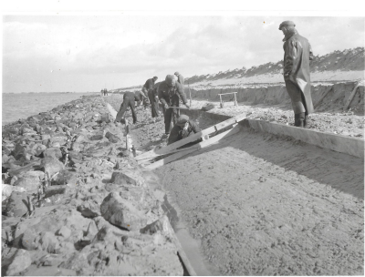 Arbeider bezig met het bekleden van het zandlichaam ...