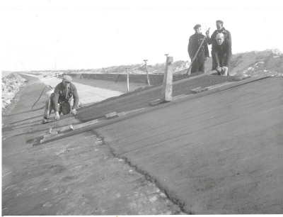 Arbeiders bezig met het bekleden van het zandlichaam...