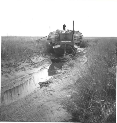 Bootje geladen met riet in een drooggevallen vaart, ...