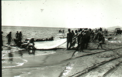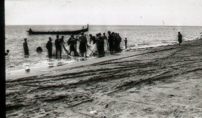 Mensen met visnetten op het strand, gebied van de Pe...