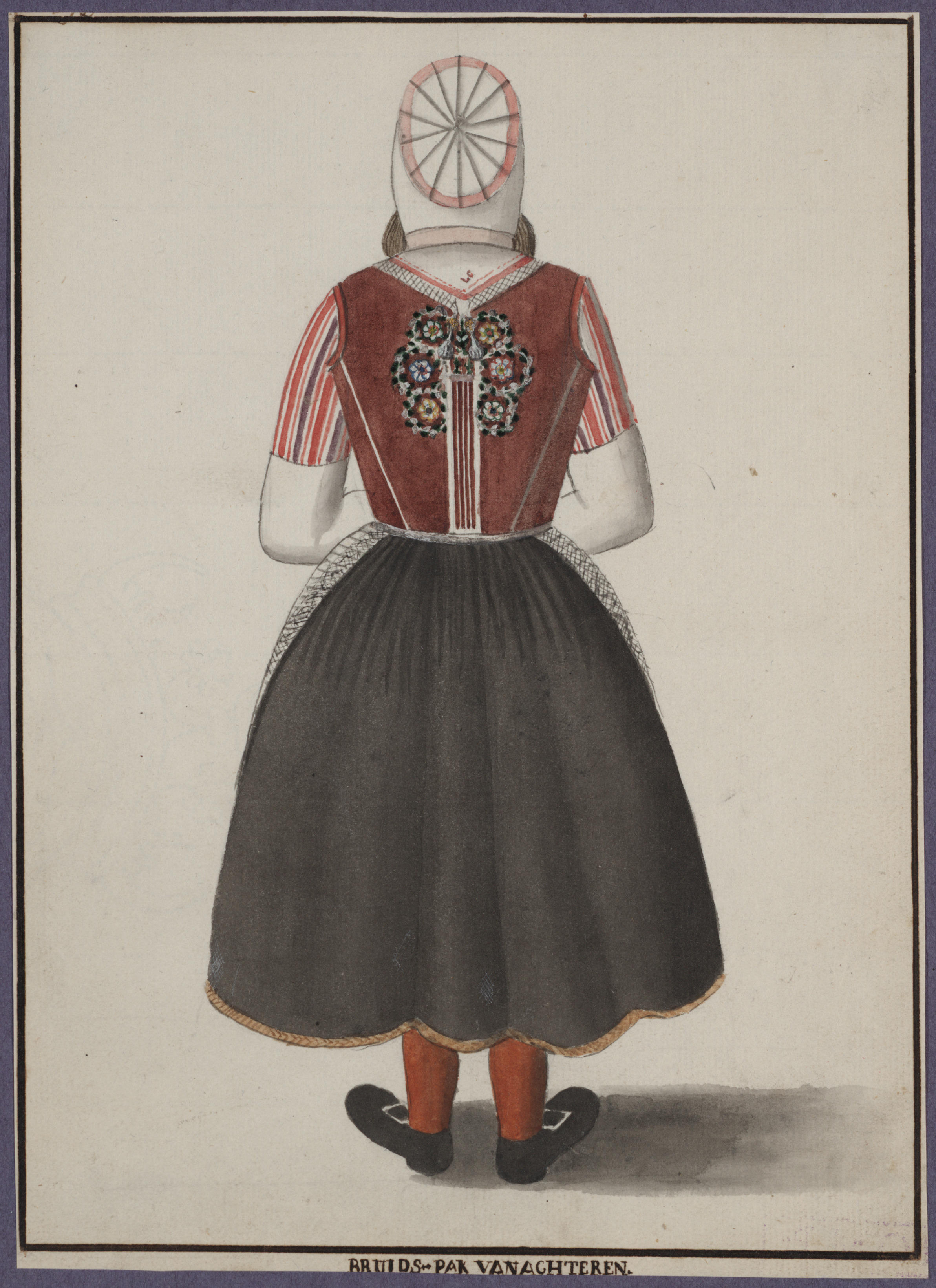 Bruid in rijglijf met de zeven rozen, Marken, 1800–1900