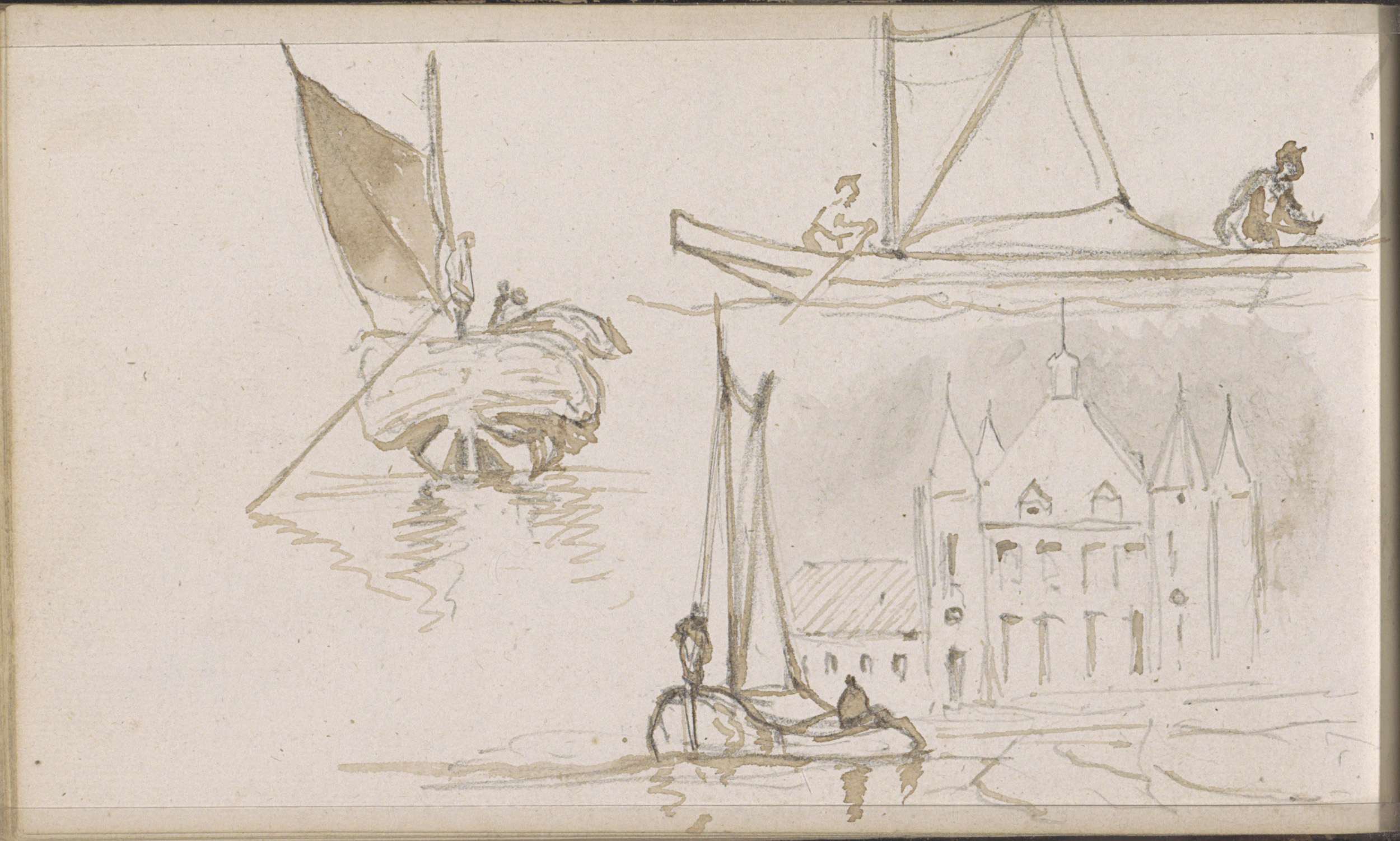 Zeilschepen op een rivier bij een gebouw met vijf to...