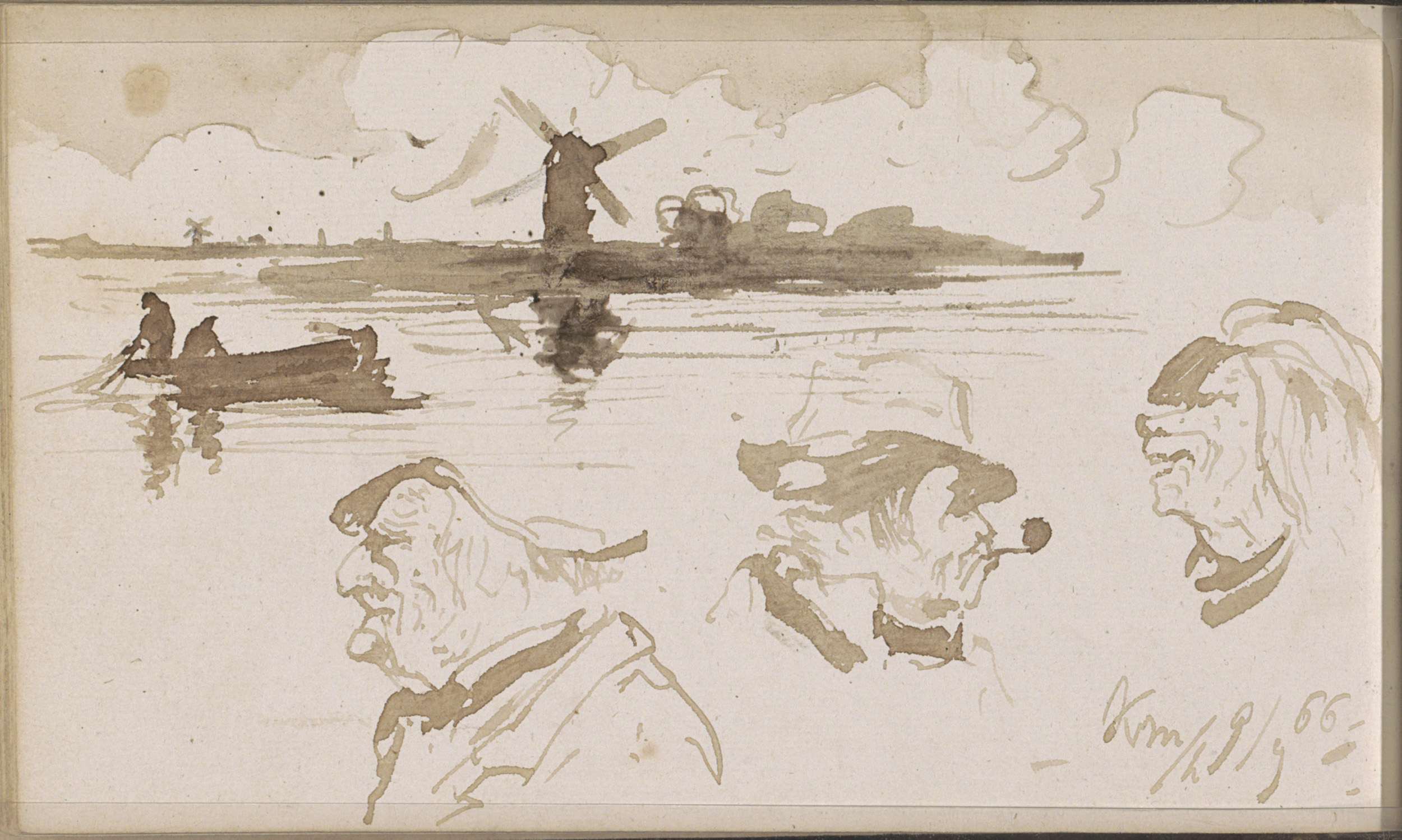 Rivierlandschap met een molen en mannenkoppen