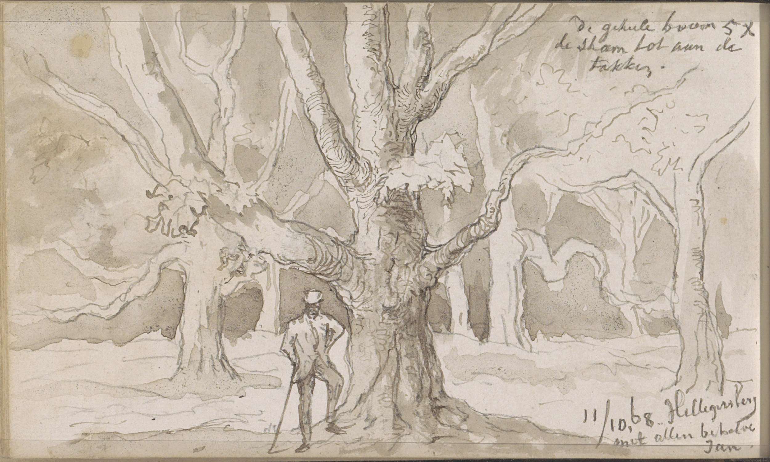 Man met een wandelstok bij een boom in een bos