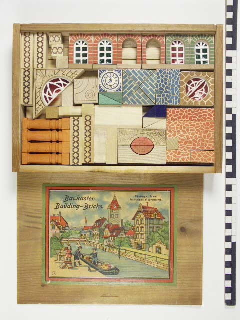 Blokkendoos met gekleurde blokken in houten kist met...