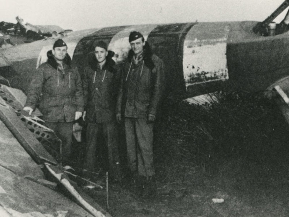 Foto drie Amerikaanse militairen bij vliegtuigwrak
