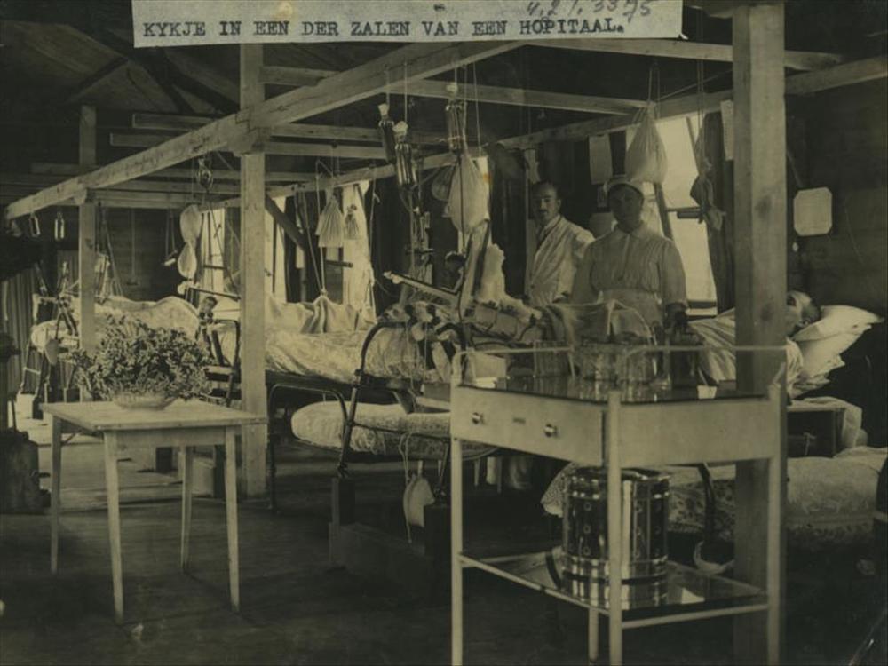 WO I; Britse ziekenzaal in hospitaal meet arts en ve...