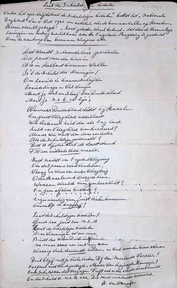 "Laat de schuldigen betalen" (gedicht, handgeschreven)