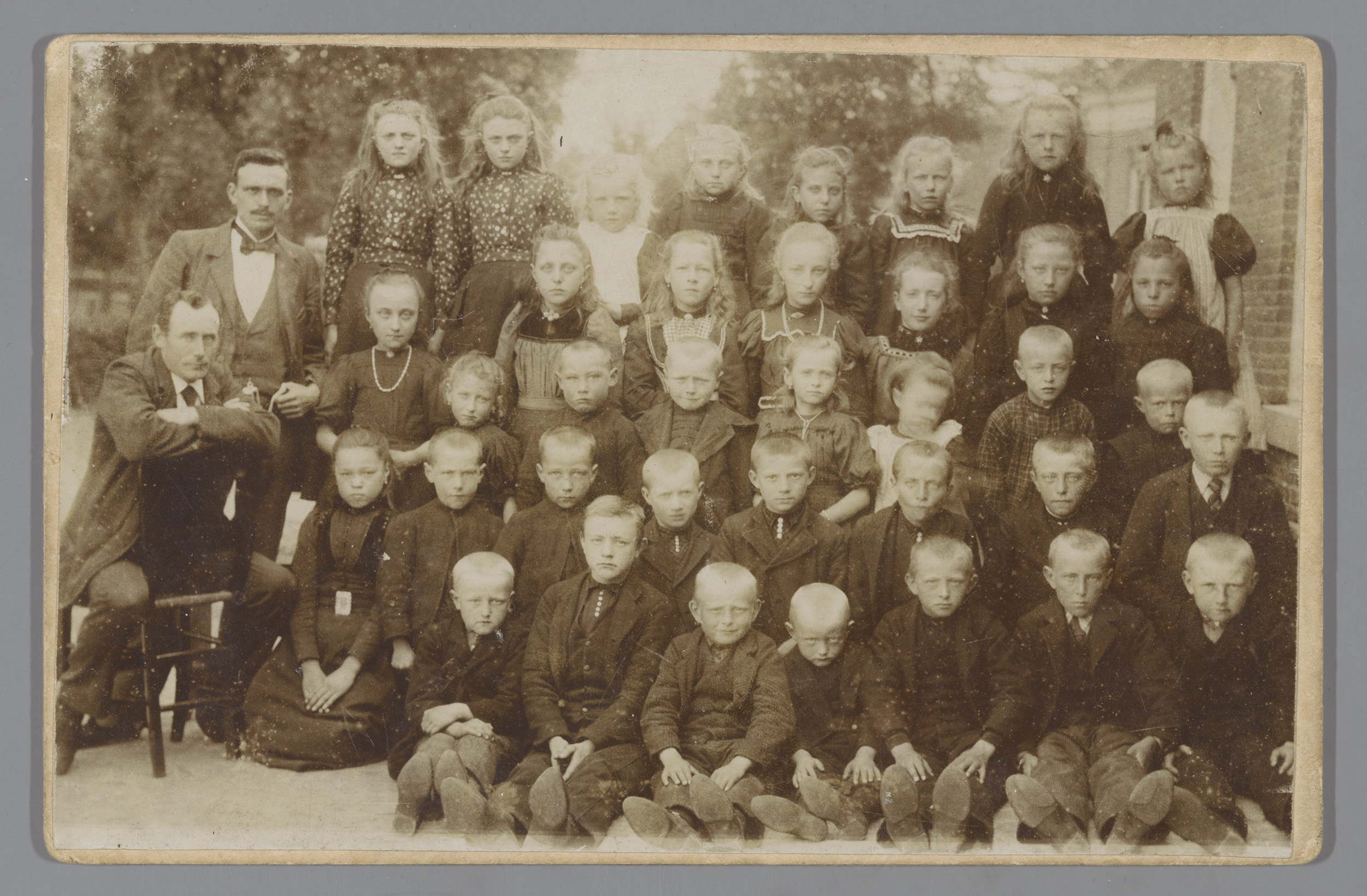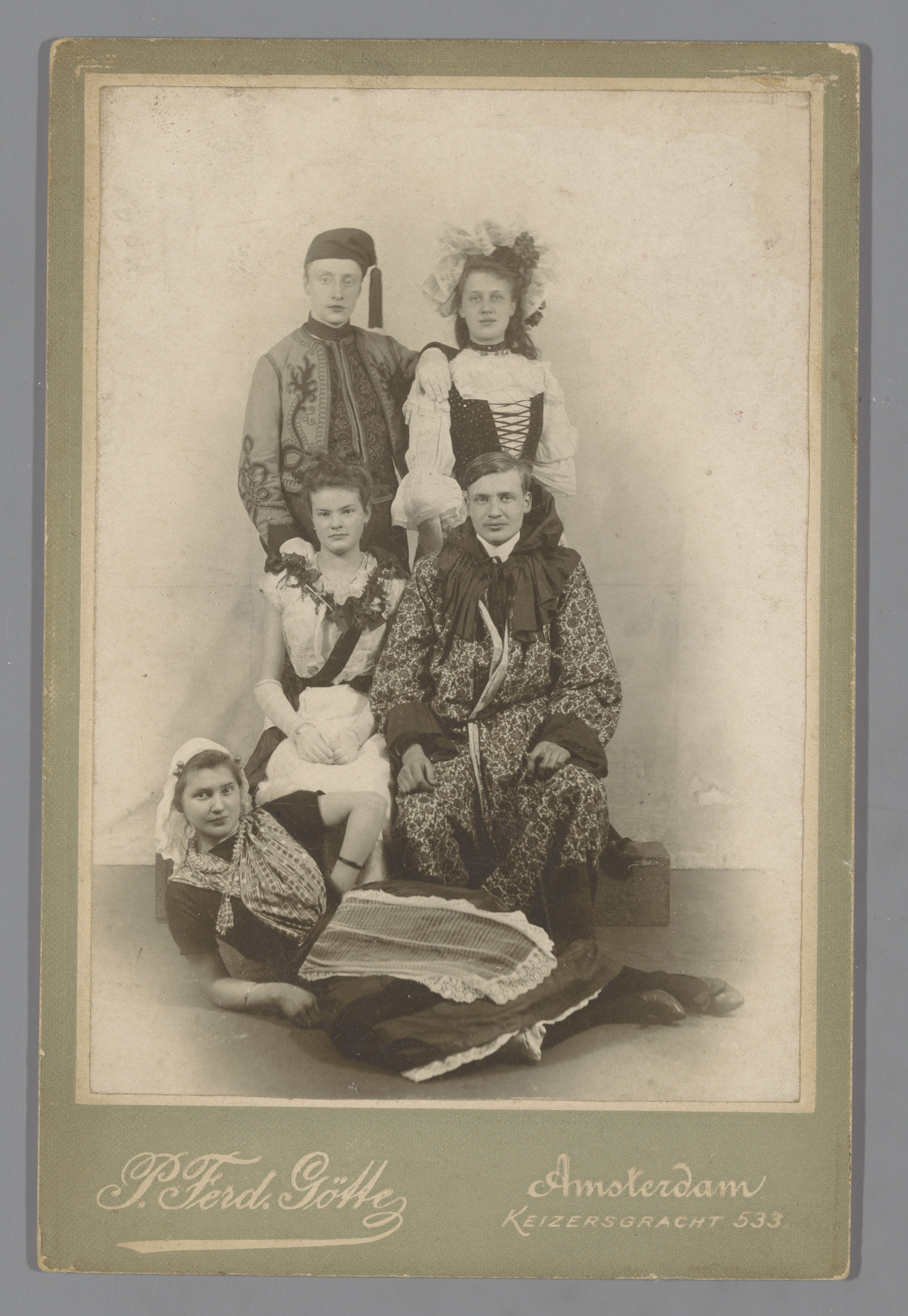 Groepsportret van jonge mannen en vrouwen in klederd...