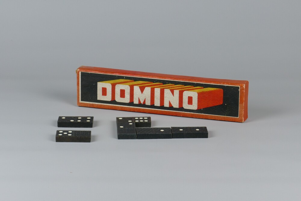 Dominostenen in kartonnen doos met opdruk in zwart, ...